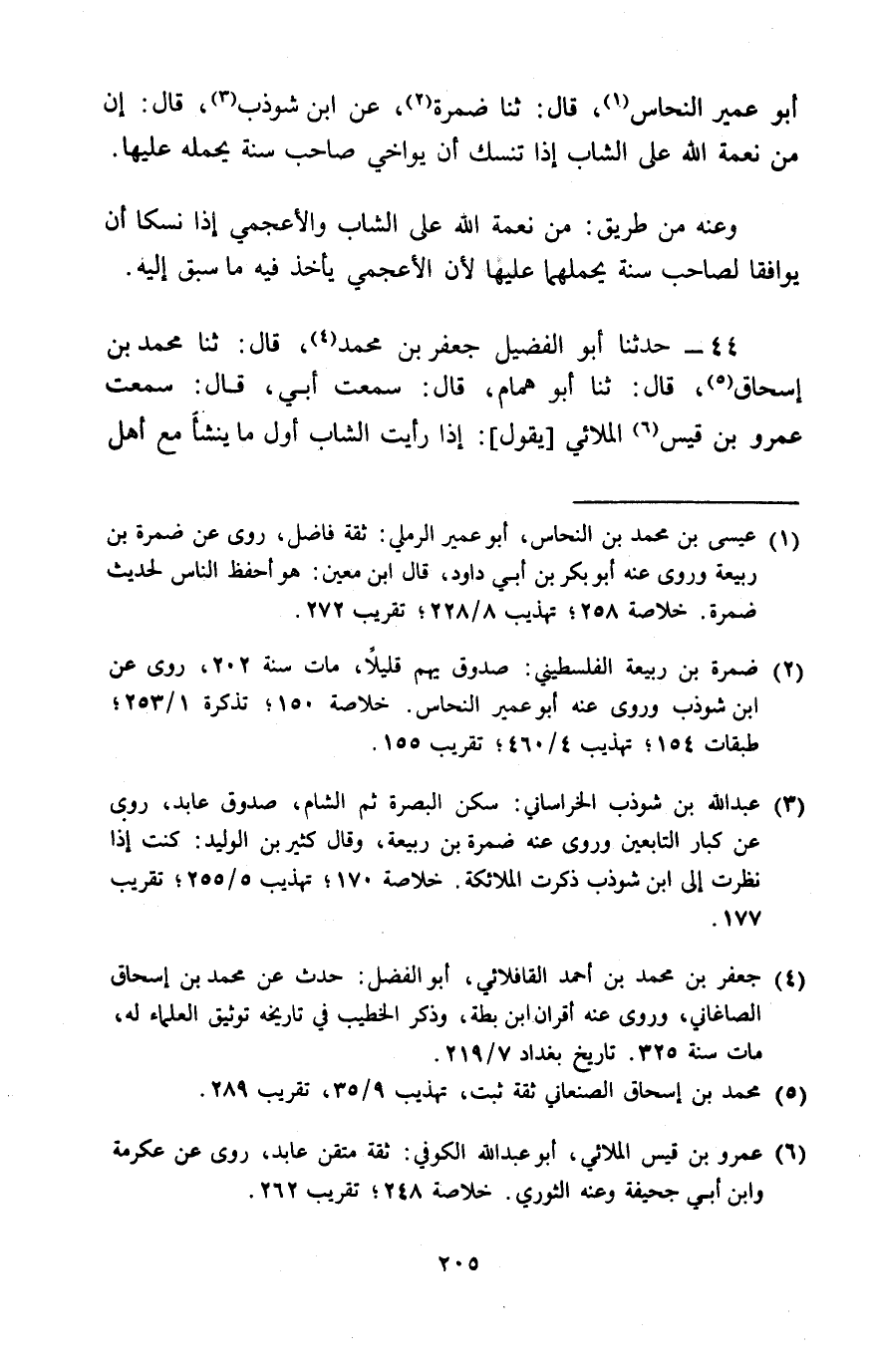 44 - حَدَّثَنَا أَبُو الْفُضَيْلِ جَعْفَرُ بْنُ مُحَمَّدٍ، قَالَ: ثنا مُحَمَّدُ بْنُ إِسْحَاقَ، قَالَ: ثنا أَبُو هَمَّامٍ، قَالَ: سَمِعْتُ أَبِي، قَالَ: سَمِعْتُ عَمْرَو بْنَ قَيْسٍ الْمُلَائِيَّ، يَقُولُ: § «إِذَا رَأَيْتَ الشَّابَّ أَوَّلَ مَا يَنْشَأُ مَعَ أَهْلِ -[206]- السُّنَّةِ وَالْجَمَاعَةِ فَارْجُهُ، وَإِذَا رَأَيْتَهُ مَعَ أَهْلِ الْبِدَعِ، فَايْئَسْ مِنْهُ، فَإِنَّ الشَّابَّ عَلَى أَوَّلِ نُشُوئِهِ»