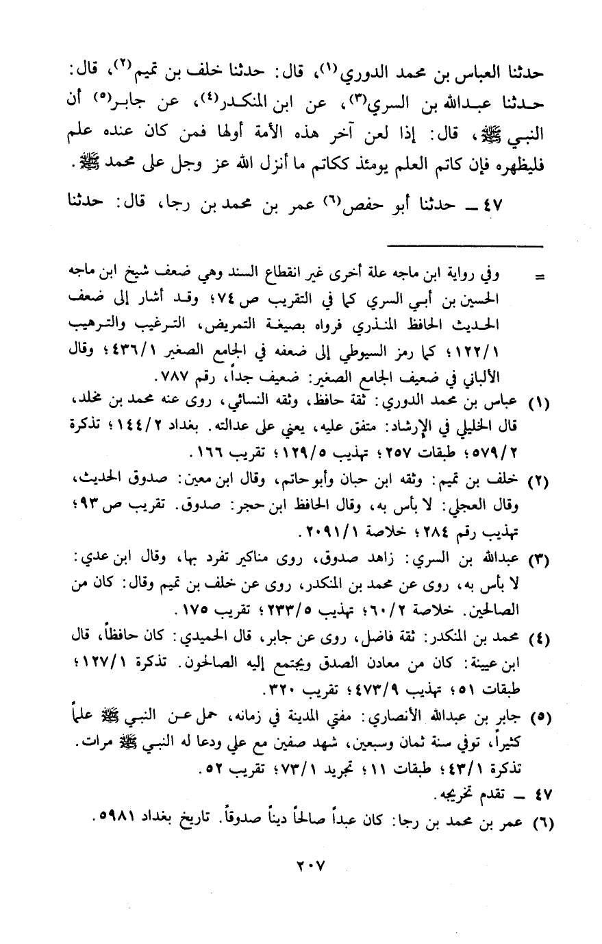 47 - حَدَّثَنَا أَبُو حَفْصٍ عُمَرُ بْنُ مُحَمَّدِ بْنِ رَجَا، قَالَ: حَدَّثَنَا -[208]- أَبُو جَعْفَرٍ مُحَمَّدُ بْنُ دَاوُدَ الْمِصِّيصِيُّ، قَالَ: حَدَّثَنَا مُحَمَّدُ بْنُ رِزْقِ اللَّهِ الْكَلَوْذَانِيُّ، قَالَ: حَدَّثَنَا خَلَفُ بْنُ تَمِيمٍ، حَدَّثَنَا عَبْدُ اللَّهِ بْنُ السَّرِيِّ، قَالَ: حَدَّثَنِي مُحَمَّدُ بْنُ الْمُنْكَدِرِ، عَنْ جَابِرِ بْنِ عَبْدِ اللَّهِ، قَالَ: قَالَ رَسُولُ اللَّهِ صَلَّى اللَّهُ عَلَيْهِ وَسَلَّمَ: «§إِذَا لَعَنَ آخِرُ هَذِهِ الْأُمَّةِ أَوَّلَهَا، فَمَنْ كَانَ عِنْدَهُ عِلْمٌ فَلْيُظْهِرْهُ، فَإِنَّ كَاتِمَ الْعِلْمِ يَوْمَئِذٍ كَكَاتِمِ مَا أَنْزَلَ اللَّهُ عَلَى مُحَمَّدٍ صَلَّى اللَّهُ عَلَيْهِ وَسَلَّمَ»