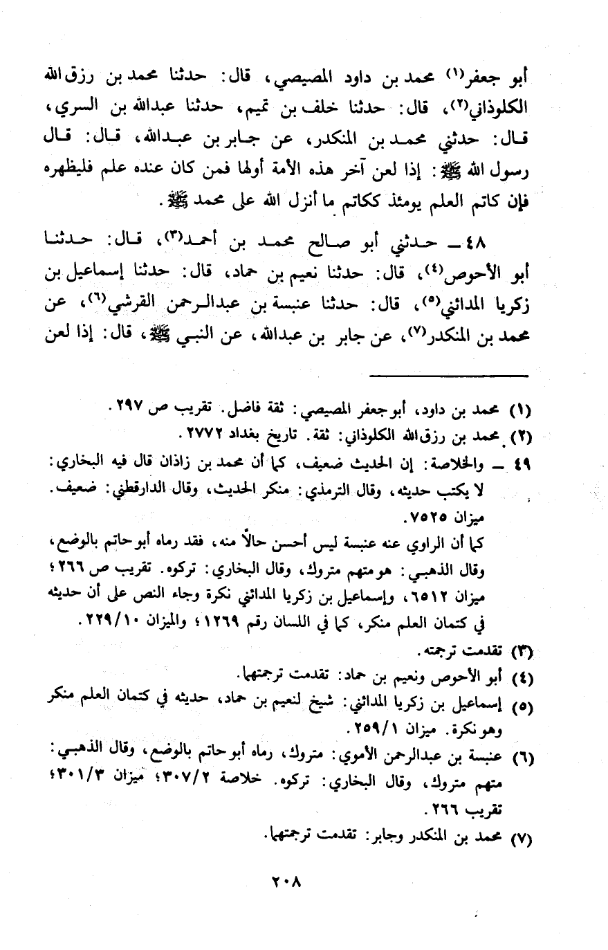 48 - حَدَّثَنِي أَبُو صَالِحٍ مُحَمَّدُ بْنُ أَحْمَدَ، قَالَ: حَدَّثَنَا أَبُو الْأَحْوَصِ، قَالَ: حَدَّثَنَا نُعَيْمُ بْنُ حَمَّادٍ، قَالَ: حَدَّثَنَا إِسْمَاعِيلُ بْنُ زَكَرِيَّا الْمَدَائِنِيُّ، قَالَ: حَدَّثَنَا عَنْبَسَةُ بْنُ عَبْدِ الرَّحْمَنِ الْقُرَشِيُّ، عَنْ مُحَمَّدِ بْنِ الْمُنْكَدِرِ، عَنْ جَابِرِ بْنِ عَبْدِ اللَّهِ، عَنِ النَّبِيِّ صَلَّى اللَّهُ عَلَيْهِ وَسَلَّمَ قَالَ: § «إِذَا لَعَنَ -[209]- آخِرُ هَذِهِ الْأُمَّةِ أَوَّلَهَا فَلْيُظْهِرِ الَّذِي عِنْدَهُ عِلْمٌ عِلْمَهُ، فَإِنَّ كَاتِمَ الْعِلْمِ كَكَاتِمِ مَا أَنْزَلَ اللَّهُ عَزَّ وَجَلَّ»