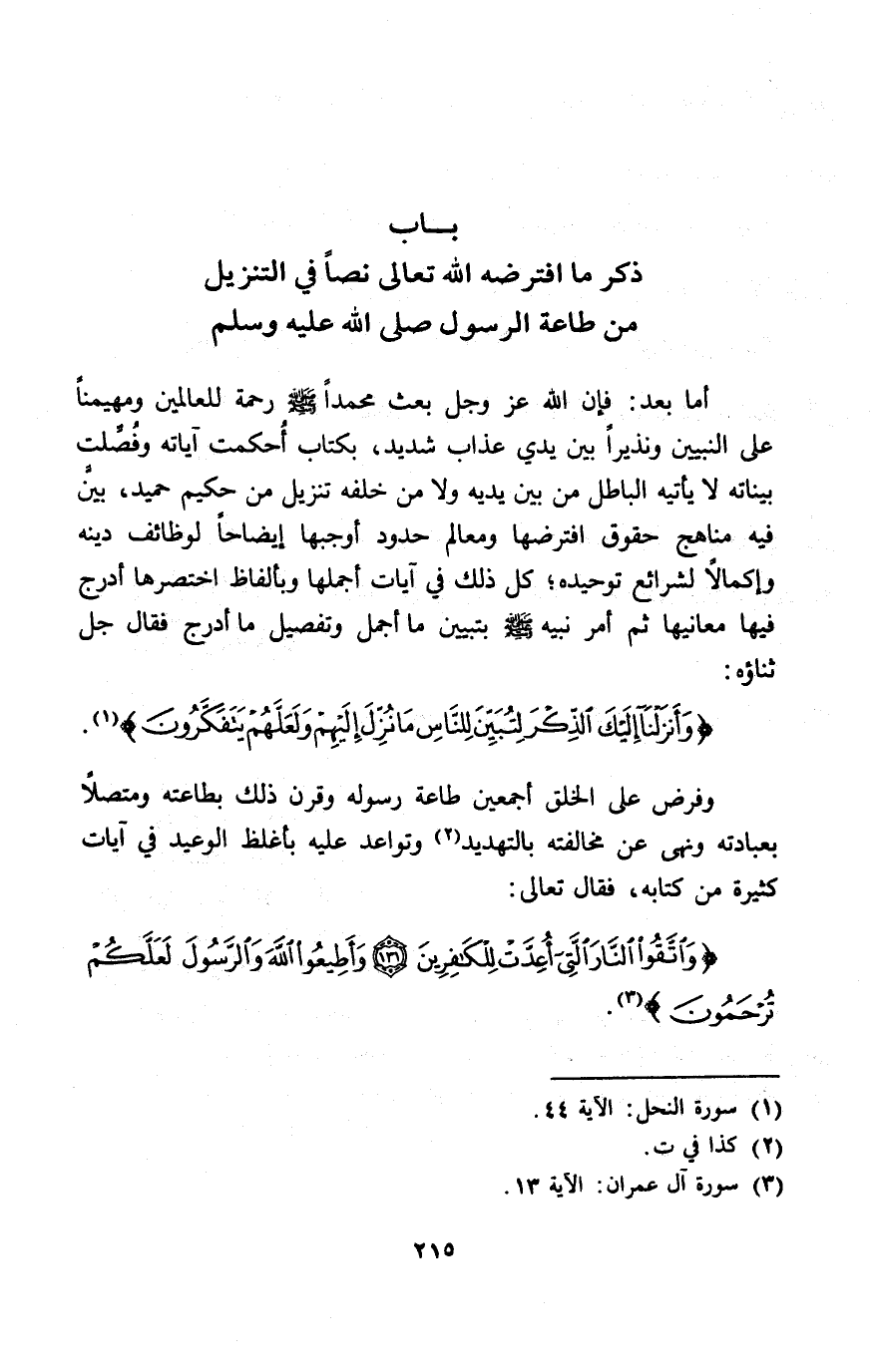 §بَابُ ذِكْرِ مَا افْتَرَضَهُ اللَّهُ تَعَالَى نَصًّا فِي التَّنْزِيلِ مِنْ طَاعَةِ الرَّسُولِ صَلَّى اللَّهُ عَلَيْهِ وَسَلَّمَ " أَمَّا بَعْدُ: فَإِنَّ اللَّهَ عَزَّ وَجَلَّ بَعَثَ مُحَمَّدًا صَلَّى اللَّهُ عَلَيْهِ وَسَلَّمَ رَحْمَةً لِلْعَالَمِينَ وَمُهَيْمِنًا عَلَى النَّبِيِّينَ وَنَذِيرًا بَيْنَ يَدَيْ عَذَابٍ شَدِيدٍ بِكِتَابٍ أُحْكِمَتْ آيَاتُهُ وَفُصِّلَتْ بَيِّنَاتُهُ لَا يَأْتِيهِ الْبَاطِلُ مِنْ بَيْنِ يَدَيْهِ، وَلَا مِنْ خَلْفِهِ تَنْزِيلٌ مِنْ حَكِيمٍ حَمِيدٍ، بَيَّنَ فِيهِ مَنَاهِجَ حُقُوقٍ افْتَرَضَهَا، وَمَعَالِمَ حُدُودٍ أَوْجَبَهَا إِيضَاحًا لِوَظَائِفِ دِينِهِ، وَإِكْمَالًا لِشَرَائِعِ تَوْحِيدِهِ، كُلُّ ذَلِكَ فِي آيَاتٍ أَجْمَلَهَا، وَبِأَلْفَاظٍ اخْتَصَرَهَا أَدْرَجَ فِيهَا مَعَانِيَهَا مِنْ ثُمَّ أَمَرَ نَبِيَّهُ صَلَّى اللَّهُ عَلَيْهِ وَسَلَّمَ بِتَبْيِينِ مَا أَجْمَلَ، وَتَفْصِيلِ مَا أَدْرَجَ، فَقَالَ جَلَّ ثَنَاؤُهُ: {وَأَنْزَلْنَا إِلَيْكَ الذِّكْرَ لِتُبَيِّنَ لِلنَّاسِ مَا نُزِّلَ إِلَيْهِمْ وَلَعَلَّهُمْ يَتَفَكَّرُونَ} [النحل: 44] وَفَرَضَ عَلَى الْخَلْقِ أَجْمَعِينَ طَاعَةَ رَسُولِهِ، وَقَرَنَ ذَلِكَ بِطَاعَتِهِ، وَمُتَصِّلًا بِعِبَادَتِهِ، وَنَهَى عَنْ مُخَالَفَتِهِ بِالتَّهْدِيدِ، وَتَوَاعَدَ عَلَيْهِ بَأَغْلَظِ الْوَعِيدِ فِي آيَاتٍ كَثِيرَةٍ مِنْ كِتَابِهِ، فَقَالَ تَعَالَى: {وَاتَّقُوا النَّارَ الَّتِي أُعِدَّتْ لِلْكَافِرِينَ وَأَطِيعُوا اللَّهَ وَالرَّسُولَ لَعَلَّكُمْ تُرْحَمُونَ} [آل عمران: 132]،