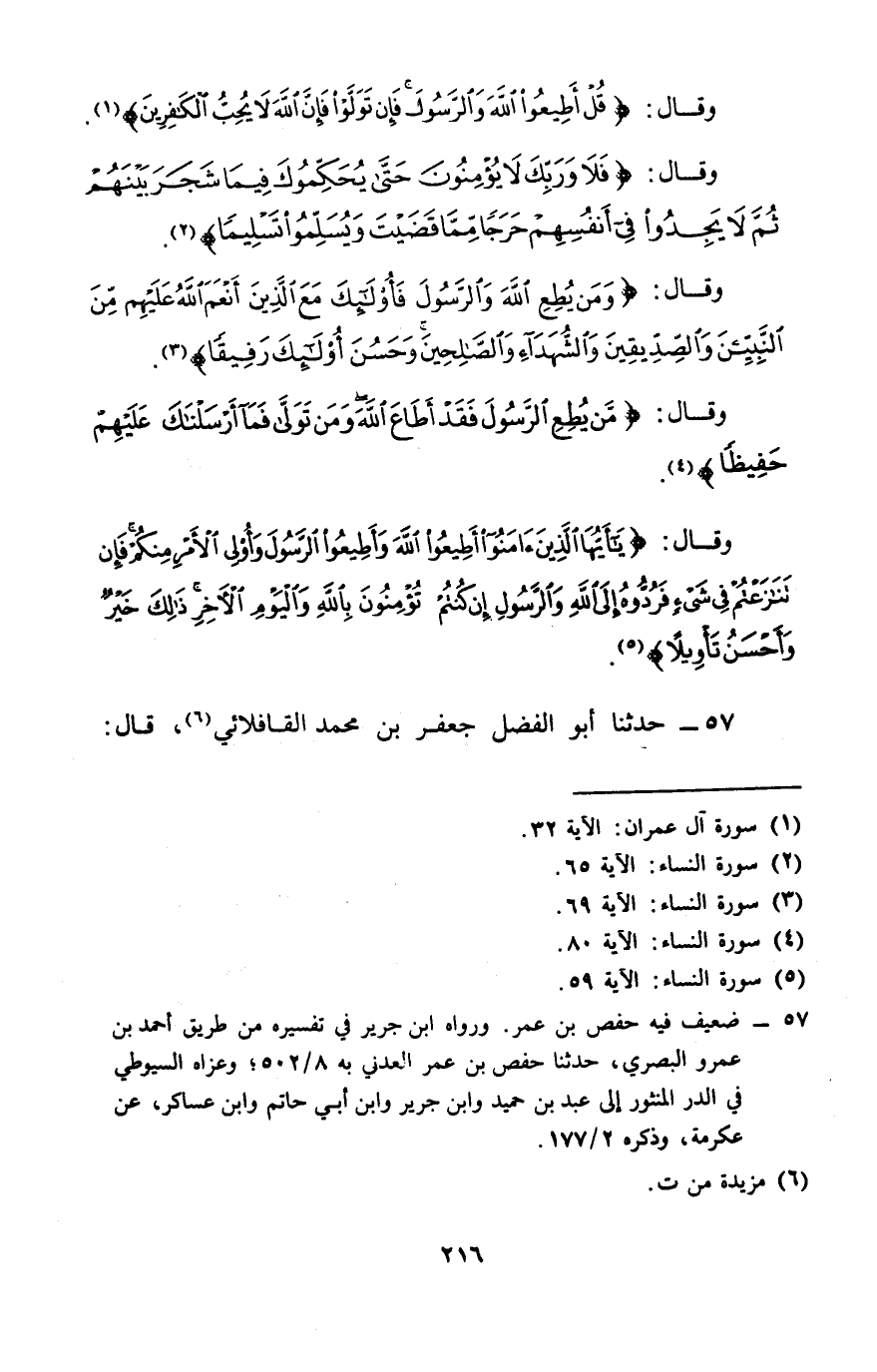 وَقَالَ: {قُلْ أَطِيعُوا اللَّهَ وَالرَّسُولَ فَإِنْ تَوَلَّوْا فَإِنَّ اللَّهَ لَا يُحِبُّ الَكَافِرِينَ} [آل عمران: 32]، وَقَالَ: {فَلَا وَرَبِّكَ لَا يُؤْمِنُونَ حَتَّى يُحَكِّمُوكَ فِيمَا شَجَرَ بَيْنَهُمْ ثُمَّ لَا يَجِدُوا فِي أَنْفُسِهِمْ حَرَجًا مِمَّا قَضَيْتَ وَيُسَلِّمُوا تَسْلِيمًا} [النساء: 65]، وَقَالَ: {وَمَنْ يُطِعِ اللَّهَ وَالرَّسُولَ فَأُولَئِكَ مَعَ الَّذِينَ أَنْعَمَ اللَّهُ عَلَيْهِمْ مِنَ النَّبِيِّينَ وَالصِّدِّيقِينَ وَالشُّهَدَاءِ وَالصَّالِحِينَ وَحَسُنَ أُولَئِكَ رَفِيقًا} [النساء: 69]، وَقَالَ: {مَنْ يُطِعِ الرَّسُولَ فَقَدْ أَطَاعَ اللَّهَ وَمَنْ تَوَلَّى فَمَا أَرْسَلْنَاكَ عَلَيْهِمْ حَفِيظًا} [النساء: 80]، وَقَالَ: {يَا أَيُّهَا الَّذِينَ آمَنُوا أَطِيعُوا اللَّهَ وَأَطِيعُوا الرَّسُولَ وَأُولِي الْأَمْرِ مِنْكُمْ فَإِنْ تَنَازَعْتُمْ فِي شَيْءٍ فَرُدُّوهُ إِلَى اللَّهِ وَالرَّسُولِ إِنْ كُنْتُمْ تُؤْمِنُونَ بِاللَّهِ وَالْيَوْمِ الْآخِرِ ذَلِكَ خَيْرٌ وَأَحْسَنُ تَأْوِيلًا} [النساء: 59] "