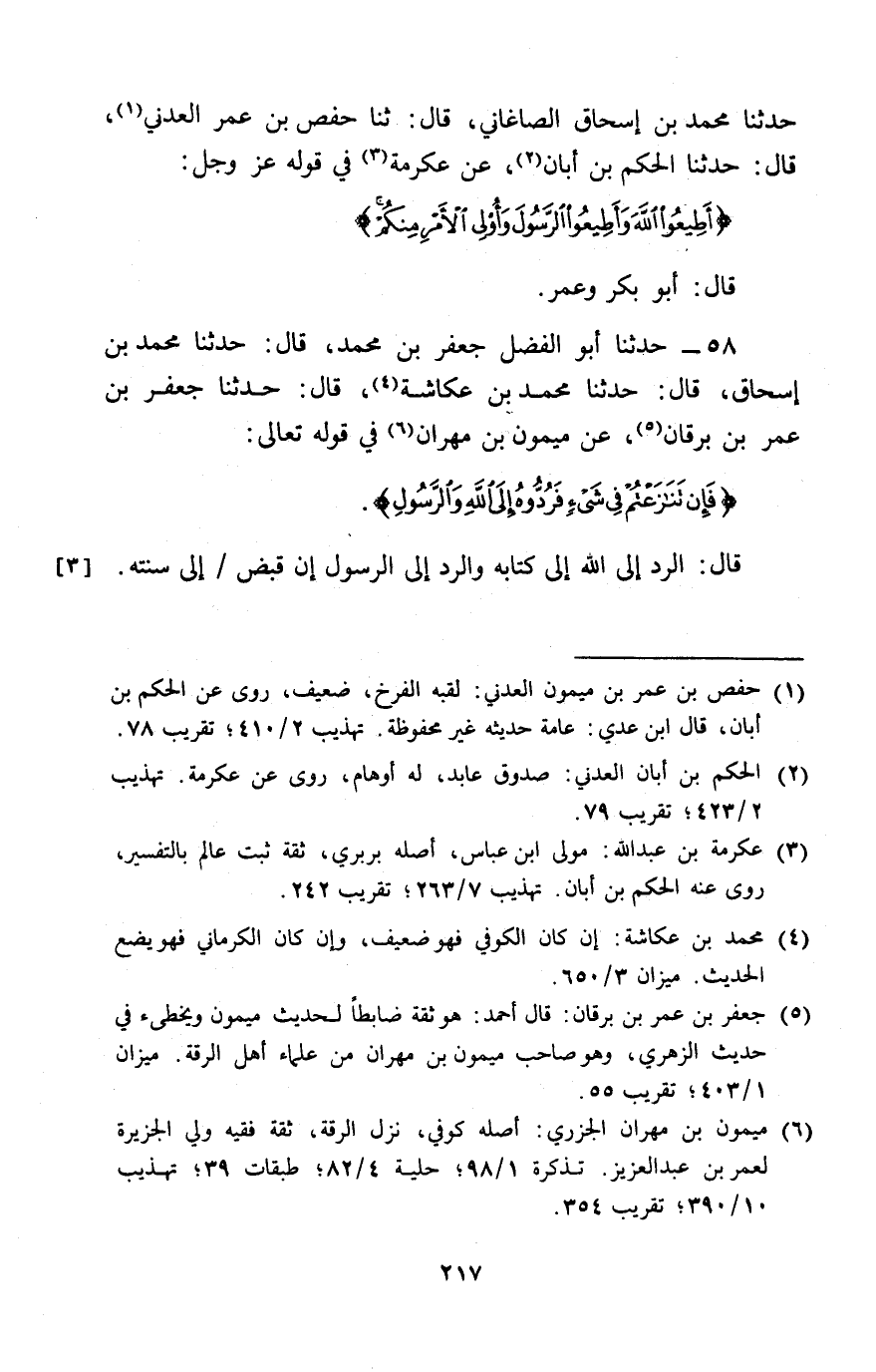 58 - حَدَّثَنَا أَبُو الْفَضْلِ جَعْفَرُ بْنُ مُحَمَّدٍ، قَالَ: حَدَّثَنَا مُحَمَّدُ بْنُ إِسْحَاقَ، قَالَ: حَدَّثَنَا مُحَمَّدُ بْنُ عُكَّاشَةَ، قَالَ: حَدَّثَنَا جَعْفَرُ بْنُ عُمَرَ بْنِ بُرْقَانَ، عَنْ مَيْمُونِ بْنِ مِهْرَانَ، فِي قَوْلِهِ تَعَالَى: {§فَإِنْ تَنَازَعْتُمْ فِي شَيْءٍ فَرُدُّوهُ إِلَى اللَّهِ وَالرَّسُولِ} [النساء: 59] قَالَ: «الرَّدُّ إِلَى اللَّهِ إِلَى كِتَابِهِ، وَالرَّدُّ إِلَى الرَّسُولِ إِنْ قُبِضَ إِلَى سُنَّتِهِ»