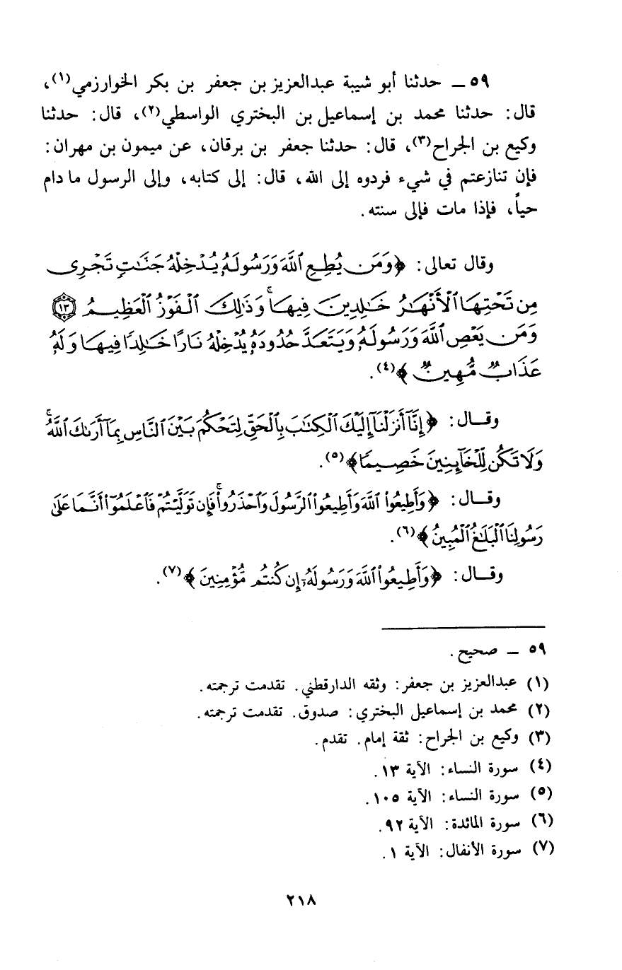 59 - حَدَّثَنَا أَبُو شَيْبَةَ عَبْدُ الْعَزِيزِ بْنُ جَعْفَرِ بْنِ بَكْرٍ الْخُوَارَزْمِيُّ، قَالَ: حَدَّثَنَا مُحَمَّدُ بْنُ إِسْمَاعِيلَ بْنِ الْبَخْتَرِيِّ الْوَاسِطِيُّ، قَالَ: حَدَّثَنَا وَكِيعُ بْنُ الْجَرَّاحِ، قَالَ: حَدَّثَنَا جَعْفَرُ بْنُ بُرْقَانَ، عَنْ مَيْمُونِ بْنِ مِهْرَانَ، {§فَإِنْ تَنَازَعْتُمْ فِي شَيْءٍ فَرُدُّوهُ إِلَى اللَّهِ} [النساء: 59] قَالَ: إِلَى كِتَابِهِ وَإِلَى الرَّسُولِ مَا دَامَ حَيًّا، فَإِذَا مَاتَ فَإِلَى سُنَّتِهِ، وَقَالَ تَعَالَى: {وَمَنْ يُطِعِ اللَّهَ وَرَسُولَهُ يُدْخِلْهُ جَنَاتٍ تَجْرِي مِنْ تَحْتِهَا الْأَنْهَارُ خَالِدِينَ فِيهَا وَذَلِكَ الْفَوْزُ الْعَظِيمُ وَمَنْ يَعْصِ اللَّهَ وَرَسُولَهُ وَيَتَعَدَّ حُدُودَهُ يُدْخِلْهُ نَارًا خَالِدًا فِيهَا وَلَهُ عَذَابٌ مُهِينٌ} [النساء: 14] وَقَالَ: {إِنَّا أَنْزَلْنَا إِلَيْكَ الْكِتَابَ بِالْحَقِّ لِتَحْكُمَ بَيْنَ النَّاسِ بِمَا أَرَاكَ اللَّهُ وَلَا تَكُنْ لِلْخَائِنِينَ خَصِيمًا} [النساء: 105] وَقَالَ: {وَأَطِيعُوا اللَّهَ وَأَطِيعُوا الرَّسُولَ وَاحْذَرُوا فَإِنْ تَوَلَّيْتُمْ فَاعْلَمُوا أَنَّمَا عَلَى رَسُولِنَا الْبَلَاغُ الْمُبِينُ} [المائدة: 92] وَقَالَ: {وَأَطِيعُوا اللَّهَ وَرَسُولَهُ إِنْ كُنْتُمْ مُؤْمِنِينَ} [الأنفال: 1]-[219]- وَقَالَ: {يَا أَيُّهَا الَّذِينَ آمَنُوا اسْتَجِيبُوا لِلَّهِ وَلِلرَّسُولِ إِذَا دَعَاكُمْ لِمَا يُحْيِيكُمْ} [الأنفال: 24]، وَقَالَ: {وَأَطِيعُوا اللَّهَ وَرَسُولَهُ وَلَا تَنَازَعُوا فَتَفْشَلُوا وَتَذْهَبَ رِيحُكُمْ} [الأنفال: 46]، وَقَالَ: {إِنَّمَا كَانَ قَوْلَ الْمُؤْمِنِينَ إِذَا دُعُوا إِلَى اللَّهِ وَرَسُولِهِ لِيَحْكُمَ بَيْنَهُمْ أَنْ يَقُولُوا سَمِعْنَا وَأَطَعْنَا وَأُولَئِكَ هُمُ الْمُفْلِحُونِ} [النور: 51] وَقَالَ: {وَمَنْ يُطِعِ اللَّهَ وَرَسُولَهُ وَيَخْشَ اللَّهَ وَيَتَّقِهِ فَأُولَئِكَ هُمُ الْفَائِزُونِ} [النور: 52]، وَقَالَ: {وَأَقِيمُوا الصَّلَاةَ وَآتُوا الزَّكَاةَ وَأَطِيعُوا الرَّسُولَ لَعَلَّكُمْ تُرْحَمُونَ} [النور: 56]، وَقَالَ: {قُلْ أَطِيعُوا اللَّهَ وَأَطِيعُوا الرَّسُولَ فَإِنْ تَوَلَّوْا فَإِنَّمَا عَلَيْهِ مَا حُمِّلَ وَعَلَيْكُمْ مَا حُمِّلْتُمْ وَإِنْ تُطِيعُوهُ تَهْتَدُوا وَمَا عَلَى الرَّسُولِ إِلَّا الْبَلَاغُ الْمُبِينُ} [النور: 54]، وَقَالَ: {لَا تَجْعَلُوا دُعَاءَ الرَّسُولِ بَيْنَكُمْ كَدُعَاءِ بَعْضِكُمْ بَعْضًا قَدْ يَعْلَمُ اللَّهُ الَّذِينَ يَتَسَلَّلُونَ مِنْكُمْ لِوَاذًا فَلْيَحْذَرِ الَّذِينَ يُخَالِفُونَ عَنْ أَمْرِهِ أَنْ تُصِيبَهُمْ فِتْنَةٌ أَوْ يُصِيبَهُمْ عَذَابٌ أَلِيمٌ} [النور: 63]، -[220]- وَقَالَ: {إِنَّمَا الْمُؤْمِنُونَ الَّذِينَ آمَنُوا بِاللَّهِ وَرَسُولِهِ وَإِذَا كَانُوا مَعَهُ عَلَى أَمْرٍ جَامِعٍ لَمْ يَذْهَبُوا حَتَّى يَسْتَأْذِنُوهُ إِنَّ الَّذِينَ يَسْتَأْذِنُونَكَ} [النور: 62] الْآيَةَ، وَقَالَ: {وَمَنْ يُطِعِ اللَّهَ وَرَسُولَهُ فَقَدْ فَازَ فَوْزًا عَظِيمًا} [الأحزاب: 71]، وَقَالَ: {وَمَا كَانَ لِمُؤْمِنٍ وَلَا مُؤْمِنَةٍ إِذَا قَضَى اللَّهُ وَرَسُولُهُ أَمْرًا أَنْ يَكُونَ لَهُمُ الْخِيَرَةُ مِنْ أَمْرِهِمْ وَمَنْ يَعْصِ اللَّهَ وَرَسُولَهُ فَقَدْ ضَلَّ ضَلَالًا مُبِينًا} [الأحزاب: 36]، وَقَالَ: {لَقَدْ كَانَ لَكُمْ فِيهِمْ أُسْوَةٌ} [الممتحنة: 6] حَسَنَةٌ لِمَنْ كَانَ يَرْجُو اللَّهَ وَالْيَوْمَ الْآخِرَ، وَقَالَ: {يَا أَيُّهَا الَّذِينَ آمَنُوا لَا تُقَدِّمُوا بَيْنَ يَدَيِ اللَّهِ وَرَسُولِهِ وَاتَّقُوا اللَّهَ إِنَّ اللَّهَ سَمِيعٌ عَلِيمٌ} [الحجرات: 1] إِلَى قَوْلِهِ: {غَفُورٌ رَحِيمٌ} [البقرة: 173] كُلُّهَا فِي طَاعَةِ الرَّسُولِ. وَقَالَ: {وَمَنْ يُطِعِ اللَّهَ وَرَسُولَهُ يُدْخِلْهُ جَنَاتٍ تَجْ