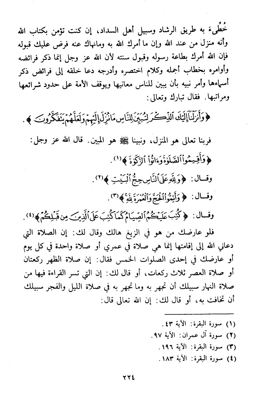 خُطِّئَ بِهِ طَرِيقُ الرَّشَادِ وَسَبِيلُ أَهْلِ السَّدَادِ، إِنْ كُنْتَ تُؤْمِنُ بِكِتَابِ اللَّهِ، وَأَنَّهُ مُنَزَّلٌ مِنْ عِنْدِ اللَّهِ، وَأَنَّ مَا أَمَرَكَ اللَّهُ بِهِ وَمَا نَهَاكَ عَنْهُ فَرْضٌ عَلَيْكَ قَبُولُهُ، فَإِنَّ اللَّهَ أَمَرَكَ بِطَاعَةِ رَسُولِهِ وَقَبُولِ سُنَّتِهِ، لِأَنَّ اللَّهَ عَزَّ وَجَلَّ إِنَّمَا ذَكَرَ فَرَائِضَهُ وَأَوَامِرَهُ بِخِطَابٍ أَجْمَلَهُ، وَكَلَامٍ اخْتَصَرَهُ وَأَدْرَجَهُ، دَعَا خَلْقَهُ إِلَى فَرَائِضَ ذَكَرَ أَسْمَاءَهَا، وَأَمَرَ نَبِيَّهُ بِأَنْ يُبَيِّنَ لِلنَّاسِ مَعَانِيَهَا، وَيُوقِفَ الْأُمَّةَ عَلَى حُدُودِ شَرَائِعِهَا وَمَرَاتِبِهَا، فَقَالَ تَبَارَكَ وَتَعَالَى: {وَأَنْزَلْنَا إِلَيْكَ الذِّكْرَ لِتُبَيِّنَ لِلنَّاسِ مَا نُزِّلَ إِلَيْهِمْ وَلَعَلَّهُمْ يَتَفَكَّرُونَ} [النحل: 44] فَرَبُّنَا تَعَالَى هُوَ الْمُنْزِلُ، وَنَبِيُّنَا صَلَّى اللَّهُ عَلَيْهِ وَسَلَّمَ هُوَ الْمُبَيِّنُ قَالَ اللَّهُ عَزَّ وَجَلَّ: {وَأَقِيمُوا الصَّلَاةَ وَآتُوا الزَّكَاةَ} [البقرة: 43]، وَقَالَ: {وَلِلَّهِ عَلَى النَّاسِ حِجُّ الْبَيْتِ} [آل عمران: 97] وَقَالَ: {وَأَتِمُّوا الْحَجَّ وَالْعُمْرَةَ لِلَّهِ} [البقرة: 196]، وَقَالَ: {كُتِبَ عَلَيْكُمُ الصِّيَامُ كَمَا كُتِبَ عَلَى الَّذِينَ مِنْ قَبْلِكُمْ} [البقرة: 183]. فَلَوْ عَارَضَكَ مَنْ هُوَ فِي الزَّيْغِ هَالِكٌ، وَقَالَ لَكَ: إِنَّ الصَّلَاةَ الَّتِي دَعَانِي اللَّهُ إِلَى إِقَامَتِهَا إِنَّمَا هِيَ صَلَاةٌ فِي عُمْرِي أَوْ صَلَاةٌ وَاحِدَةٌ فِي كُلِّ يَوْمٍ، أَوْ عَارَضَكَ فِي إِحْدَى الصَّلَوَاتِ الْخَمْسِ، فَقَالَ: إِنَّ صَلَاةَ الظُّهْرِ رَكْعَتَانِ، أَوْ صَلَاةَ الْعَصْرِ ثَلَاثُ رَكَعَاتٍ، أَوْ قَالَ لَكَ: إِنَّ الَّتِي تُسِرُّ الْقِرَاءَةَ فِيهَا مِنْ صَلَاةِ النَّهَارِ سَبِيلُكَ أَنْ تَجْهَرَ بِهِ , وَمَا تَجْهَرُ بِهِ فِي صَلَاةِ اللَّيْلِ وَالْفَجْرِ سَبِيلُكَ أَنْ تُخَافِتَ بِهِ، أَوْ قَالَ لَكَ: إِنَّ اللَّهَ تَعَالَى قَالَ: