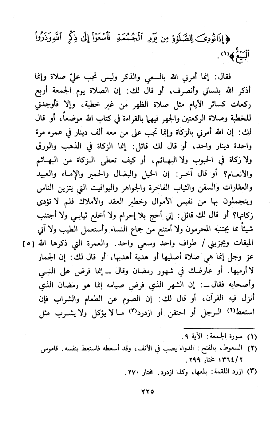 {إِذَا نُودِيَ لِلصَّلَاةِ مِنْ يَوْمِ الْجُمُعَةِ فَاسْعَوْا إِلَى ذِكْرِ اللَّهِ وَذَرُوا الْبَيْعَ} [الجمعة: 9]، فَقَالَ: إِنَّمَا أَمَرَنِي اللَّهُ بِالسَّعْيِ وَالذِّكْرِ وَلَيْسَ تَجِبُ عَلَيَّ صَلَاةٌ، وَإِنَّمَا أَذْكُرُ اللَّهَ بِلِسَانِي، وَأَنْصَرِفُ، أَوْ قَالَ لَكَ: إِنَّ الصَّلَاةَ يَوْمَ الْجُمُعَةِ أَرْبَعُ رَكَعَاتٍ كَسَائِرِ الْأَيَّامِ مِثْلُ صَلَاةِ الظُّهْرِ مِنْ غَيْرِ خُطْبَةٍ، وَإِلَّا فَأَوْجِدْ لِي لِلْخُطْبَةِ وَصَلَاةِ الرَّكْعَتَيْنِ وَالْجَهْرِ فِيهِمَا بِالْقِرَاءَةِ فِي كِتَابِ اللَّهِ مَوْضِعًا، أَوْ قَالَ لَكَ: إِنَّ اللَّهَ أَمَرَنِي بِالزَّكَاةِ، وَإِنَّمَا تَجِبُ عَلَى مَنْ مَعَهُ أَلْفُ دِينَارٍ فِي عُمْرِهِ مَرَّةً وَاحِدَةً دِينَارٌ وَاحِدٌ، أَوْ قَالَ لَكَ قَائِلٌ: إِنَّمَا الزَّكَاةُ فِي الذَّهَبِ وَالْوَرِقِ، وَلَا زَكَاةَ فِي الْحُبُوبِ، وَلَا الْبَهَائِمِ، أَوْ كَيْفَ تُعْطَى الزَّكَاةُ مِنَ الْبَهَائِمِ، وَالْأَنْعَامِ؟، أَوْ قَالَ آخَرُ: إِنَّ الْخَيْلَ وَالْبِغَالَ وَالْحَمِيرَ، وَالْإِمَاءَ، وَالْعَبِيدَ، وَالْعَقَارَاتِ، وَالسُّفُنَ، وَالثِّيَابَ الْفَاخِرَةَ، وَالْجَوَاهِرَ، وَالْيَوَاقِيتَ الَّتِي يَتَزَيَّنُ النَّاسُ، وَيَتَجَمَّلُونَ بِهَا مِنْ نَفِيسِ الْأَمْوَالِ، وَخَطِيرِ الْعِقْدِ وَالْأَمْلَاكِ، فَلِمَ لَا تُؤَدَّى زَكَاتُهَا؟، أَوْ قَالَ لَكَ قَائِلٌ: إِنِّي أَحُجُّ بِلَا إِحْرَامٍ، وَلَا أَخْلَعُ ثِيَابِي، وَلَا أَجْتَنِبُ شَيْئًا مِمَّا يَجْتَنِبُهُ الْمُحْرِمُونَ، وَلَا أَمْتَنِعُ مِنْ جِمَاعِ النِّسَاءِ، وَأَسْتَعْمِلُ الطِّيبَ، وَلَا آتِي الْمِيقَاتَ، وَيُجْزِينِي طَوَافٌ وَاحِدٌ وَسَعْيٌ وَاحِدٌ، وَالْعُمْرَةُ الَّتِي ذَكَرَهَا اللَّهُ عَزَّ وَجَلَّ إِنَّمَا هِيَ صَلَاةٌ أُصَلِّيهَا أَوْ هَدِيَّةٌ أُهْدِيهَا، أَوْ قَالَ لَكَ: إِنَّ الْجِمَارَ لَا أَرْمِيهَا، أَوْ عَارَضَكَ فِي شُهُورِ رَمَضَانَ، وَقَالَ: إِنَّمَا فُرِضَ عَلَى النَّبِيِّ وَأَصْحَابِهِ، فَقَالَ: إِنَّ الشَّهْرَ الَّذِي فُرِضَ صِيَامُهُ إِنَّمَا هُوَ رَمَضَانُ الَّذِي أُنْزِلَ فِيهِ الْقُرْآنُ، أَوْ قَالَ لَكَ: إِنَّ الصَّوْمَ عَنِ الطَّعَامِ وَالشَّرَابِ، فَإِنِ اسْتَعَطَ الرَّجُلُ أَوِ احْتَقَنَ، أَوِ ازْدَرَدَ مَا لَا يُؤْكَلُ وَلَا يُشْرَبُ، مِثْلُ