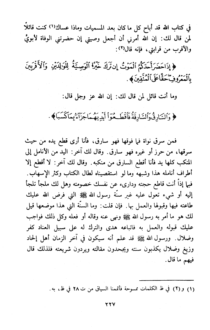 فِي كِتَابِ اللَّهِ قَدْ أَبَاحَ كُلَّ مَا كَانَ بَعْدَ الْمُسَمَّيَاتِ، وَمَاذَا عَسَاكَ كُنْتَ قَائِلًا لِمَنْ قَالَ لَكَ: إِنَّ اللَّهَ أَمَرَنِي أَنْ أَجْعَلَ وَصِيَّتِي إِنْ حَضَرَتْنِي الْوَفَاةُ لَأَبَوَيَّ، وَالْأَقْرَبِ مِنْ قَرَابَتِي، فَإِنَّهُ قَالَ: {إِذَا حَضَرَ أَحَدَكُمُ الْمَوْتُ إِنْ تَرَكَ خَيْرًا الْوَصِيَّةُ لِلْوَالِدَيْنِ وَالْأَقْرَبِينَ بِالْمَعْرُوفِ حَقًّا عَلَى الْمُتَّقِينَ} [البقرة: 180]؟ وَمَا أَنْتَ قَائِلٌ لِمَنْ قَالَ لَكَ: إِنَّ اللَّهَ عَزَّ وَجَلَّ قَالَ: {وَالسَّارِقُ وَالسَّارِقَةُ فَاقْطَعُوا أَيْدِيَهُمَا جَزَاءً بِمَا كَسَبَا} [المائدة: 38] فَمَنْ سَرَقَ نَوَاةً فَمَا فَوْقَهَا فَهُوَ سَارِقٌ، فَأَنَا أَرَى قَطْعَ يَدِهِ مِنْ حَيْثُ سَرَقَهَا مِنْ حِرْزٍ أَوْ غَيْرِهِ فَهُوَ سَارِقٌ، وَقَالَ لَكَ آخَرُ: الْيَدُ مِنَ الْأَنَامِلِ إِلَى الْمَنْكِبِ كُلُّهَا يَدٌ فَأَنَا أَقْطَعُ السَّارِقَ مِنْ مَنْكِبِهِ، وَقَالَ لَكَ آخَرُ: لَا أَقْطَعُ إِلَّا أَطْرَافَ أَنَامِلِهِ ". هَذَا وَشِبْهُهُ، وَمَا لَوِ اسْتَقْصَيْنَاهُ لَطَالَ الْكِتَابُ، وَكَثُرَ الْإِسْهَابُ، فَبِمَ إِذًا أَنْتَ قَاطَعٌ حُجَّتَهُ وَدَارِئٌ عَنْ نَفْسِكَ خُصَومَتَهُ؟ وَهَلْ لَكَ مَلْجَأٌ تَلْجَأُ إِلَيْهِ، أَوْ شَيْءٌ تُعَوِّلُ عَلَيْهِ غَيْرَ سُنَّةِ رَسُولِ اللَّهِ صَلَّى اللَّهُ عَلَيْهِ وَسَلَّمَ الَّتِي فَرَضَ اللَّهُ عَلَيْكَ طَاعَتَهُ فِيهَا وَقَبُولَهَا وَالْعَمَلَ بِهَا فَإِنْ قُلْتَ: وَمَا السُّنَّةُ الَّتِي هَذَا مَوْضِعُهَا؟ قِيلَ لَكَ هُوَ مَا أَمَرَ بِهِ رَسُولُ اللَّهِ صَلَّى اللَّهُ عَلَيْهِ وَسَلَّمَ، وَنَهَى عَنْهُ، وَقَالَهُ أَوْ فَعَلَهُ، وَكُلُّ ذَلِكَ فَوَاجِبٌ عَلَيْكَ قَبُولُهُ، وَالْعَمَلُ بِهِ فَاتِّبَاعُهُ هُدًى وَالتَّرْكُ لَهُ عَلَى سَبِيلِ الْعِنَادِ كُفْرٌ وَضَلَالٌ، وَرَسُولُ اللَّهِ صَلَّى اللَّهُ عَلَيْهِ وَسَلَّمَ قَدْ عَلِمَ أَنَّهُ سَيَكُونَ فِي آخِرِ الزَّمَانِ أَهْلُ إِلْحَادٍ وَزَيْغٍ وَضَلَالٍ يُكَذِّبُونَ سُنَّتَهُ وَيَجْحَدُونَ مَقَالَتَهُ، وَيَرُدُّونَ شَرِيعَتَهُ، فَلِذَلِكَ قَالَ فِيهِمْ مَا قَالَ ".