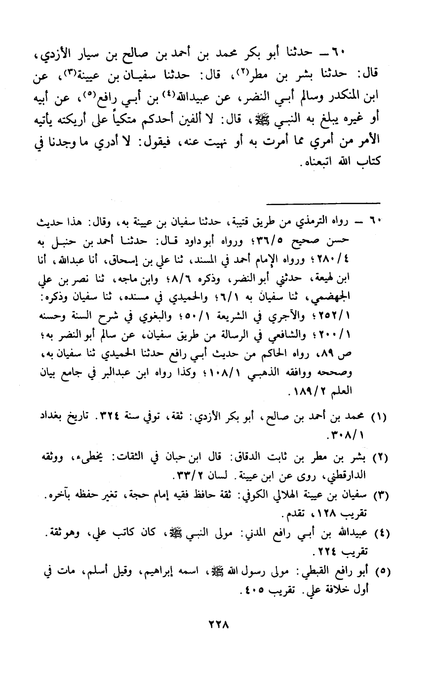 60 - حَدَّثَنَا أَبُو بَكْرٍ مُحَمَّدُ بْنُ أَحْمَدَ بْنِ صَالِحِ بْنِ سَيَّارٍ الْأَزْدِيُّ، قَالَ: حَدَّثَنَا بِشْرُ بْنُ مَطَرٍ، قَالَ: حَدَّثَنَا سُفْيَانُ بْنُ عُيَيْنَةَ، عَنِ ابْنِ الْمُنْكَدِرِ، وَسَالِمٍ أَبِي النَّضْرِ، عَنْ عُبَيْدِ اللَّهِ بْنِ أَبِي رَافِعٍ، عَنْ أَبِيهِ، أَوْ غَيْرِهِ يَبْلُغُ بِهِ النَّبِيَّ صَلَّى اللَّهُ عَلَيْهِ وَسَلَّمَ قَالَ: §" لَا أُلْفِيَنَّ أَحَدَكُمْ مُتَّكِيًا عَلَى أَرِيكَتِهِ يَأْتِيهِ الْأَمْرُ مِنْ أَمْرِي مِمَّا أَمَرْتُ بِهِ أَوْ نَهَيْتُ عَنْهُ، فَيَقُولُ: لَا أَدْرِي مَا وَجَدْنَا فِي كِتَابِ اللَّهِ اتَّبَعْنَاهُ "
