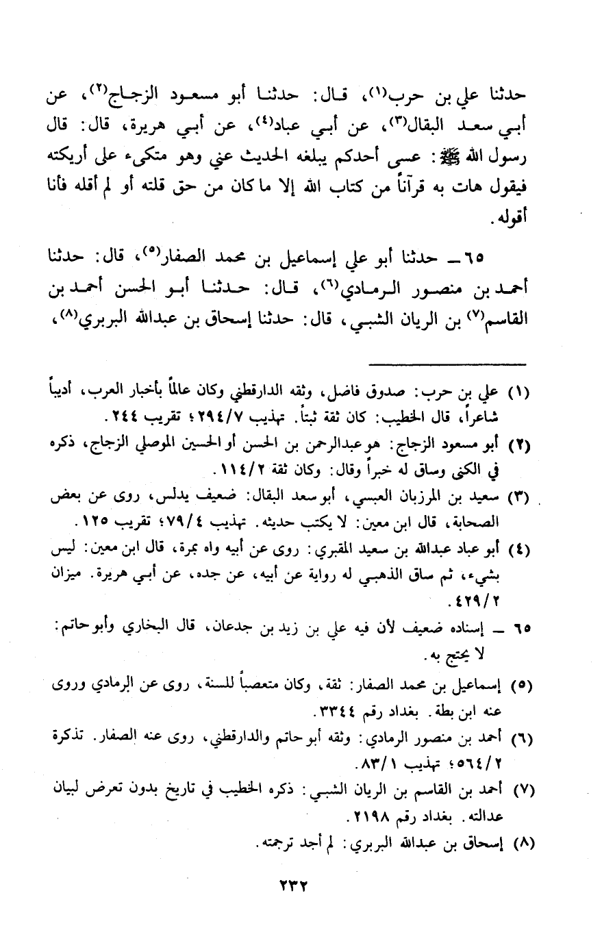 65 - حَدَّثَنَا أَبُو عَلِيٍّ إِسْمَاعِيلُ بْنُ مُحَمَّدٍ الصَّفَّارُ، قَالَ: حَدَّثَنَا أَحْمَدُ بْنُ مَنْصُورٍ الرَّمَادِيُّ، قَالَ: حَدَّثَنَا أَبُو الْحَسَنِ أَحْمَدُ بْنُ الْقَاسِمِ بْنِ الرَّيَّانِ الشَّبِّيُّ، قَالَ: حَدَّثَنَا إِسْحَاقُ بْنُ عَبْدِ اللَّهِ الْبَرْبَرِيُّ، -[233]- قَالَا: حَدَّثَنَا عَبْدُ الرَّزَّاقِ، عَنْ مَعْمَرٍ، عَنْ عَلِيِّ بْنِ زَيْدِ بْنِ جُدْعَانَ، عَنْ أَبِي نَضْرَةَ، أَوْ غَيْرِهِ قَالَ: كُنَّا عِنْدَ عِمْرَانَ بْنِ الْحُصَيْنِ، وَكُنَّا نَتَذَاكَرُ الْعِلْمَ قَالَ: فَقَالَ رَجُلٌ: لَا تَتَحَدَّثُوا إِلَّا بِمَا فِي الْقُرْآنِ , قَالَ: فَقَالَ لَهُ عِمْرَانُ بْنُ الْحُصَيْنِ: «§إِنَّكَ لَأَحْمَقُ، أَوَجَدْتَ فِي الْقُرْآنِ صَلَاةَ الظُّهْرِ أَرْبَعَ رَكَعَاتٍ، وَالْعَصْرَ أَرْبَعًا لَا تَجْهَرُ فِي شَيْءٍ مِنْهَا، وَالْمَغْرِبَ ثَلَاثًا تَجْهَرُ بِالْقِرَاءَةِ فِي رَكْعَتَيْنِ، وَلَا تَجْهَرُ بِالْقِرَاءَةِ فِي رَكْعَةٍ، وَالْعِشَاءَ أَرْبَعَ رَكَعَاتٍ تَجْهَرُ بِالْقِرَاءَةِ فِي رَكْعَتَيْنِ، وَلَا تَجْهَرُ بِالْقِرَاءَةِ فِي رَكْعَتَيْنِ، وَالْفَجْرَ رَكْعَتَيْنِ تَجْهَرُ فِيهِمَا بِالْقِرَاءَةِ». قَالَ عَلِيٌّ: وَلَمْ يَكُنِ الرَّجُلُ الَّذِي قَالَ هَذَا صَاحِبَ بِدْعَةٍ، وَلَكِنَّهَا كَانَتْ مِنْهُ زَلَّةٌ , قَالَ: ثُمَّ قَالَ عِمْرَانُ: لِمَا نَحْنُ فِيهِ يَعْدِلُ الْقُرْآنَ، أَوْ نَحْوَهُ مِنَ الْكَلَامِ