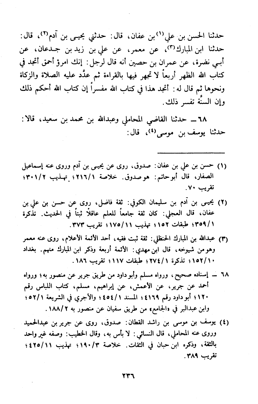 68 - حَدَّثَنَا الْقَاضِي الْمَحَامِلِيُّ، وَعَبْدُ اللَّهِ بْنُ مُحَمَّدِ بْنِ سَعِيدٍ، قَالَا: حَدَّثَنَا يُوسُفُ بْنُ مُوسَى، قَالَ: -[237]- حَدَّثَنَا جَرِيرٌ، عَنْ مَنْصُورِ بْنِ الْمُعْتَمِرِ، عَنْ إِبْرَاهِيمَ، عَنْ عَلْقَمَةَ بْنِ قَيْسٍ، قَالَ: قَالَ عَبْدُ اللَّهِ: § «لَعَنَ اللَّهُ الْوَاشِمَاتِ وَالْمُسْتَوْشِمَاتِ، وَالْمُتَنَمِّصَاتِ، وَالْمُتَفَلِّجَاتِ لِلْحُسْنِ الْمُغَيِّرَاتِ خَلْقَ اللَّهِ» قَالَ: فَبَلَغَ ذَلِكَ امْرَأَةً مِنْ بَنِي أَسَدٍ، يُقَالُ لَهَا: أُمُّ يَعْقُوبَ كَانَتْ تَقْرَأُ الْقُرْآنَ فَأَتَتْهُ، فَقَالَتْ: مَا حَدِيثٌ بَلَغَنِي عَنْكَ أَرَاكَ لَعَنْتَ الْوَاشِمَاتِ وَالْمُسْتَوْشِمَاتِ، وَالْمُتَنَمِّصَاتِ لِلْحُسْنِ، الْمُغَيِّرَاتِ خَلْقَ اللَّهِ، فَقَالَ عَبْدُ اللَّهِ: «وَمَا لِيَ لَا أَلْعَنُ مَنْ لَعَنَ رَسُولُ اللَّهِ صَلَّى اللَّهُ عَلَيْهِ وَسَلَّمَ، وَهُوَ فِي كِتَابِ اللَّهِ؟» فَقَالَتِ الْمَرْأَةُ: لَقَدْ قَرَأْتُ مَا بَيْنَ اللَّوْحَيْنِ الْمُصْحَفَ فَمَا وَجَدْتُهُ. قَالَ: " أَمَا قَرَأْتِ: {وَمَا آتَاكُمُ الرَّسُولُ فَخُذُوهُ وَمَا نَهَاكُمْ عَنْهُ فَانْتَهُوا} [الحشر: 7]؟ "