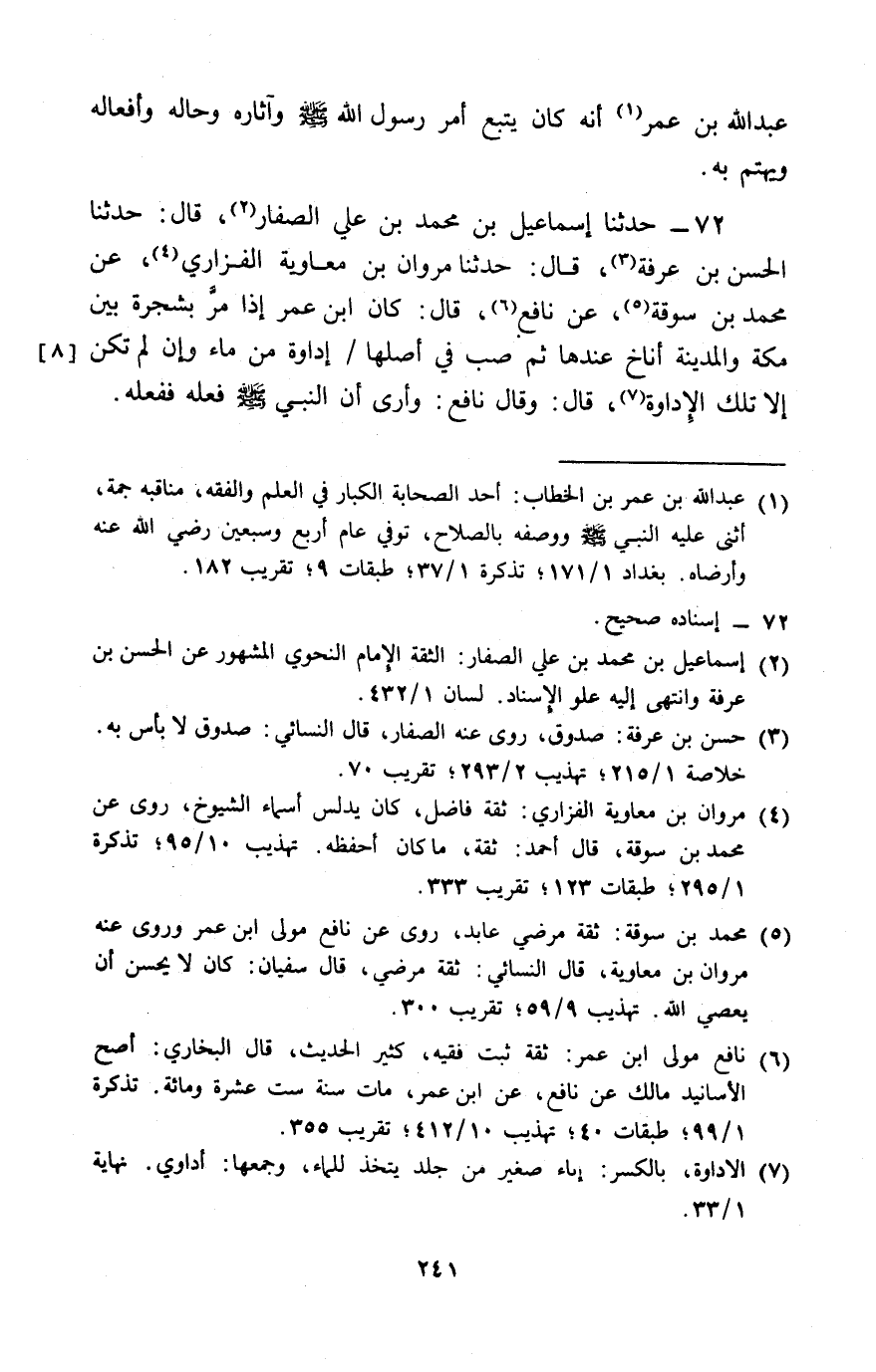 72 - حَدَّثَنَا إِسْمَاعِيلُ بْنُ مُحَمَّدِ بْنِ عَلِيٍّ الصَّفَّارُ، قَالَ: حَدَّثَنَا الْحَسَنُ بْنُ عَرَفَةَ، قَالَ: حَدَّثَنَا مَرْوَانُ بْنُ مُعَاوِيَةَ الْفَزَارِيُّ، عَنْ مُحَمَّدِ بْنِ سُوقَةَ، عَنْ نَافِعٍ، قَالَ: كَانَ ابْنُ عُمَرَ " §إِذَا مَرَّ بِشَجَرَةٍ بَيْنَ مَكَّةَ وَالْمَدِينَةِ، أَنَاخَ عِنْدَهَا، ثُمَّ صَبَّ فِي أَصْلِهَا إِدَاوَةً مِنْ مَاءٍ، وَإِنْ لَمْ تَكُنْ إِلَّا تِلْكَ الْإِدَاوَةَ قَالَ: وَقَالَ نَافِعٌ: وَأَرَى أَنَّ النَّبِيَّ صَلَّى اللَّهُ عَلَيْهِ وَسَلَّمَ فَعَلَهُ، فَفَعَلَهُ "