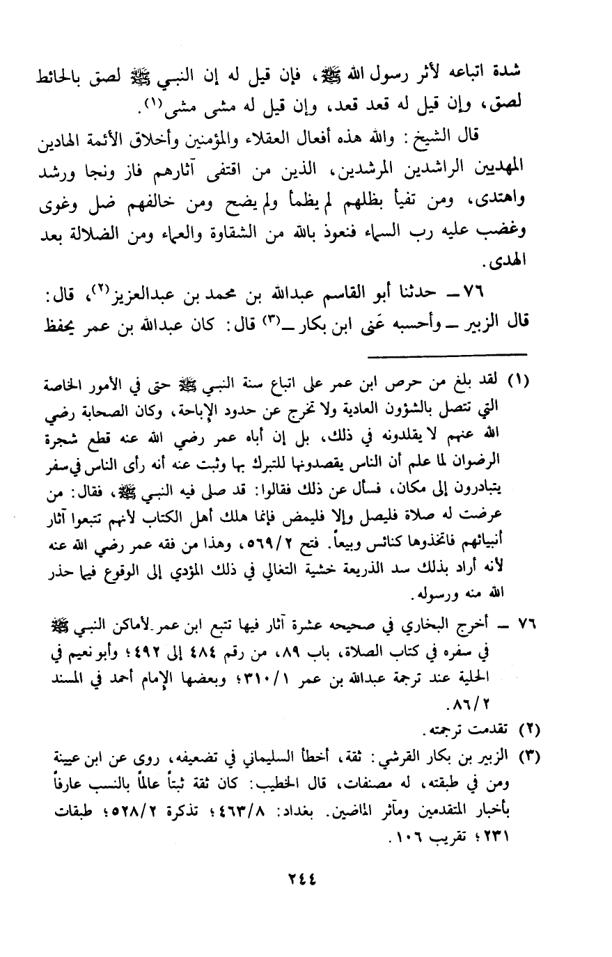 76 - حَدَّثَنَا أَبُو الْقَاسِمِ عَبْدُ اللَّهِ بْنُ مُحَمَّدِ بْنِ عَبْدِ الْعَزِيزِ، قَالَ: قَالَ الزُّبَيْرُ: - وَأَحْسِبُهُ عَنَى ابْنَ بَكَّارٍ - قَالَ: كَانَ عَبْدُ اللَّهِ بْنُ عُمَرَ يَحْفَظُ -[245]- مَا يَسْمَعُ مِنْ رَسُولِ اللَّهِ صَلَّى اللَّهُ عَلَيْهِ وَسَلَّمَ، وَإِذَا لَمْ يَحْضُرْ سَأَلَ مَنْ حَضَرَ عَمَّا قَالَ رَسُولُ اللَّهِ صَلَّى اللَّهُ عَلَيْهِ وَسَلَّمَ، وَفَعَلَ، وَكَانَ يَتَتَبَّعُ آثَارَ رَسُولِ اللَّهِ صَلَّى اللَّهُ عَلَيْهِ وَسَلَّمَ فِي كُلِّ مَسْجِدٍ صَلَّى فِيهِ، وَكَانَ يَعْتَرِضُ بِرَاحِلَتِهِ فِي كُلِّ طَرِيقٍ مَرَّ بِهَا رَسُولُ اللَّهِ صَلَّى اللَّهُ عَلَيْهِ وَسَلَّمَ، فَيُقَالُ لَهُ فِي ذَلِكَ، فَيَقُولُ: § «أَتَحَرَّى أَنْ تَقَعَ رَاحِلَتِي عَلَى بَعْضِ أَخْفَافِ رَاحِلَةِ رَسُولِ اللَّهِ صَلَّى اللَّهُ عَلَيْهِ وَسَلَّمَ» قَالَ الشَّيْخُ: «فَلِلَّهِ دَرُّ أَقْوَامٍ دَقَّتْ فِطَنُهُمْ وَصَفَتْ أَذْهَانُهُمْ، وَتَعَالَتْ بِهِمُ الْهِمَمُ فِي اتِّبَاعِ نَبِيِّهِمْ، وَتَنَاهَتْ بِهِمُ الْمَحَبَّةُ، حَتَّى اتَّبَعُوهُ هَذَا الِاتِّبَاعَ، فَبِمِثْلِ هَدْيِ هَؤُلَاءِ الْعُقَلَاءِ إِخْوَانِي فَاهْتَدُوا، وَلِآثَارِهِمْ فَاقْتَفُوا تَرْشُدُوا، وَتُنْصَرُوا وَتُجْبَرُوا»
