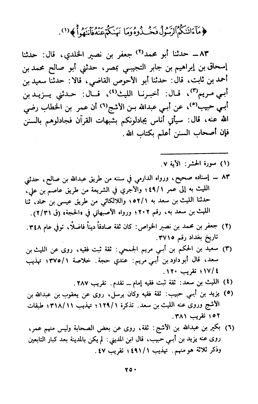 83 - حَدَّثَنَا أَبُو مُحَمَّدٍ جَعْفَرُ بْنُ نُصَيْرٍ الْخَلَدِيُّ، قَالَ: حَدَّثَنَا إِسْحَاقُ بْنُ إِبْرَاهِيمَ بْنِ جَابِرٍ التُّجِيبِيُّ، بِمِصْرَ، حَدَّثَنِي أَبُو صَالِحٍ مُحَمَّدُ بْنُ أَحْمَدَ بْنِ ثَابِتٍ، قَالَ: حَدَّثَنَا أَبُو الْأَحْوَصِ الْقَاضِي، قَالَا: حَدَّثَنَا سَعِيدُ بْنُ أَبِي مَرْيَمَ، قَالَ: أَخْبَرَنَا اللَّيْثُ، قَالَ: حَدَّثَنِي يَزِيدُ بْنُ أَبِي حَبِيبٍ، عَنْ أَبِي عَبْدِ اللَّهِ بْنِ الْأَشَجِّ، أَنَّ عُمَرَ بْنَ الْخَطَّابِ رَضِيَ اللَّهُ عَنْهُ، قَالَ: «§سَيَأْتِي أُنَاسٌ يُجَادِلُونَكُمْ بِشُبُهَاتِ الْقُرْآنِ، فَجَادِلُوهُمْ بِالسُّنَنِ، فَإِنَّ أَصْحَابَ السُّنَنِ أَعْلَمُ بِكِتَابِ اللَّهِ»