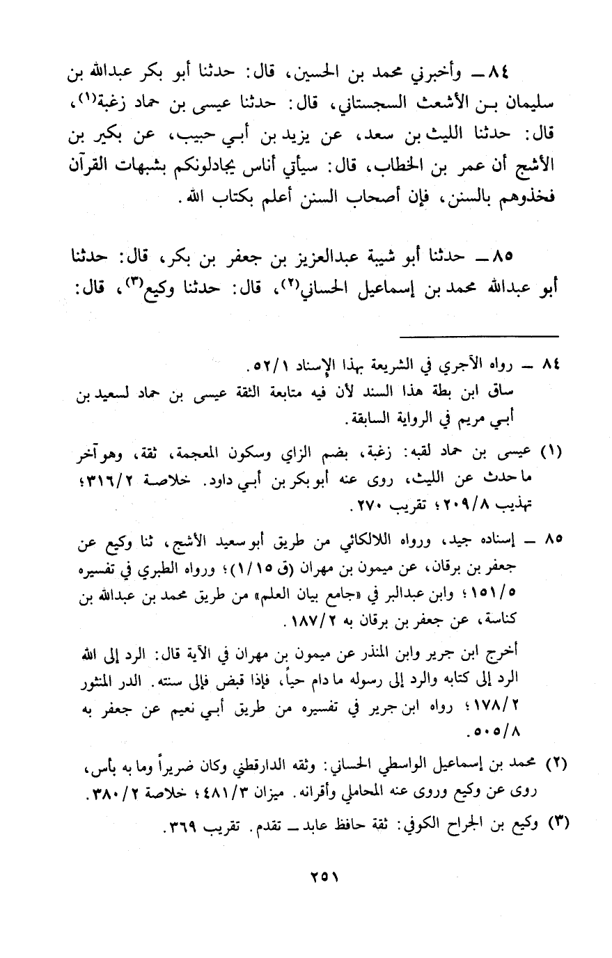 84 - وَأَخْبَرَنِي مُحَمَّدُ بْنُ الْحُسَيْنِ، قَالَ: حَدَّثَنَا أَبُو بَكْرٍ عَبْدُ اللَّهِ بْنُ سُلَيْمَانَ بْنِ الْأَشْعَثِ السِّجِسْتَانِيُّ، قَالَ: حَدَّثَنَا عِيسَى بْنُ حَمَّادٍ زُغْبَةُ، قَالَ: حَدَّثَنَا اللَّيْثُ بْنُ سَعْدٍ، عَنْ يَزِيدَ بْنِ أَبِي حَبِيبٍ، عَنْ بُكَيْرِ بْنِ الْأَشَجِّ، أَنَّ عُمَرَ بْنَ الْخَطَّابِ، قَالَ: «§سَيَأْتِي أُنَاسٌ يُجَادِلُونَكُمْ بِشُبُهَاتِ الْقُرْآنِ، فَخُذُوهُمْ بِالسُّنَنِ، فَإِنَّ أَصْحَابَ السُّنَنِ أَعْلَمُ بِكِتَابِ اللَّهِ»