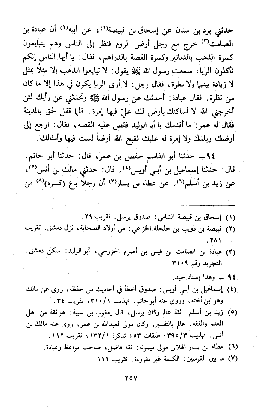 94 - حَدَّثَنَا أَبُو الْقَاسِمِ حَفْصُ بْنُ عُمَرَ، قَالَ: حَدَّثَنَا أَبُو حَاتِمٍ، قَالَ: حَدَّثَنَا إِسْمَاعِيلُ بْنُ أَبِي أُوَيْسٍ، قَالَ: حَدَّثَنِي مَالِكُ بْنُ أَنَسٍ، عَنْ زَيْدِ بْنِ أَسْلَمَ، عَنْ عَطَاءِ بْنِ يَسَارٍ، أَنَّ رَجُلًا بَاعَ كِسْرَةً مِنْ -[258]- ذَهَبٍ أَوْ وَرِقٍ بِأَكْثَرَ مِنْ وَزْنِهَا، فَقَالَ لَهُ أَبُو الدَّرْدَاءِ: سَمِعْتُ رَسُولَ اللَّهِ صَلَّى اللَّهُ عَلَيْهِ وَسَلَّمَ §يَنْهَى عَنْ مِثْلِ هَذَا إِلَّا مِثْلًا بِمِثْلٍ، فَقَالَ الرَّجُلُ: مَا أَرَى بِمِثْلِ هَذَا بَأْسًا، فَقَالَ أَبُو الدَّرْدَاءِ: مَنْ يَعْذِرُنِي مِنْ فُلَانٍ أُحَدِّثُهُ عَنْ رَسُولِ اللَّهِ صَلَّى اللَّهُ عَلَيْهِ وَسَلَّمَ، وَيُخْبِرُنِي عَنْ رَأْيِهِ؟ لَا أُسَاكِنُكَ بِأَرْضٍ أَنْتَ بِهَا، ثُمَّ قَدِمَ أَبُو الدَّرْدَاءِ عَلَى عُمَرَ بْنِ الْخَطَّابِ رَضِيَ اللَّهُ عَنْهُ، فَذَكَرَ ذَلِكَ لَهُ، فَكَتَبَ عُمَرُ بْنُ الْخَطَّابِ إِلَى الرَّجُلِ: «أَنْ لَا تَبِيعَ ذَلِكَ إِلَّا مِثْلًا بِمِثْلٍ وَزْنًا بِوَزْنٍ»