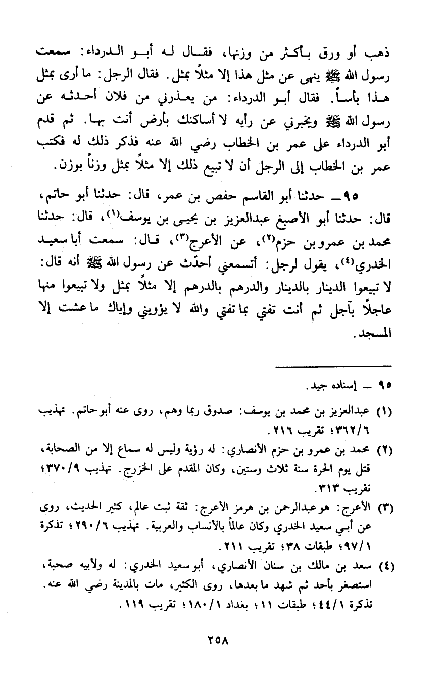 95 - حَدَّثَنَا أَبُو الْقَاسِمِ حَفْصُ بْنُ عُمَرَ، قَالَ: حَدَّثَنَا أَبُو حَاتِمٍ، قَالَ: حَدَّثَنَا أَبُو الْأَصْبَغِ عَبْدُ الْعَزِيزِ بْنُ يَحْيَى بْنِ يُوسُفَ، قَالَ: حَدَّثَنَا مُحَمَّدُ بْنُ عَمْرِو بْنِ حَزْمٍ، عَنِ الْأَعْرَجِ، قَالَ: سَمِعْتُ أَبَا سَعِيدٍ الْخُدْرِيَّ، يَقُولُ لِرَجُلٍ: أَتَسْمَعُنِي أُحَدِّثُ عَنْ رَسُولِ اللَّهِ صَلَّى اللَّهُ عَلَيْهِ وَسَلَّمَ أَنَّهُ قَالَ: «§لَا تَبِيعُوا الدِّينَارَ بِالدِّينَارِ، وَالدِّرْهَمَ بِالدِّرْهَمِ إِلَّا مِثْلًا بِمِثْلٍ، وَلَا تَبِيعُوا مِنْهَا عَاجِلًا بِآجِلٍ، ثُمَّ أَنْتَ تُفْتِي بِمَا تُفْتِي، وَاللَّهِ , لَا يُؤْوِينِي وَإِيَّاكَ مَا عِشْتُ إِلَّا الْمَسْجِدُ»