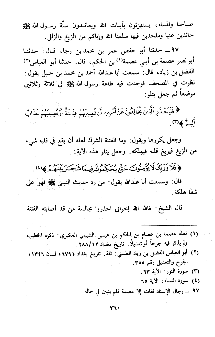 97 - حَدَّثَنَا أَبُو حَفْصٍ عُمَرُ بْنُ مُحَمَّدِ بْنِ رَجَا، قَالَ: حَدَّثَنَا أَبُو نَصْرٍ عِصْمَةُ بْنُ أَبِي عِصْمَةَ بْنِ الْحَكَمِ، قَالَ: حَدَّثَنَا أَبُو الْعَبَّاسِ الْفَضْلُ بْنُ زِيَادٍ، قَالَ: سَمِعْتُ أَبَا عَبْدِ اللَّهِ أَحْمَدَ بْنَ مُحَمَّدِ بْنِ حَنْبَلٍ يَقُولُ: نَظَرْتُ فِي الْمُصْحَفِ فَوَجَدْتُ فِيهِ طَاعَةَ رَسُولِ اللَّهِ صَلَّى اللَّهُ عَلَيْهِ وَسَلَّمَ فِي ثَلَاثَةٍ وَثَلَاثِينَ مَوْضِعًا، ثُمَّ جَعَلَ يَتْلُو: {فَلْيَحْذَرِ الَّذِينَ يُخَالِفُونَ عَنْ أَمْرِهِ أَنْ تُصِيبَهُمْ فِتْنَةٌ أَوْ يُصِيبَهُمْ عَذَابٌ أَلِيمٌ} [النور: 63] وَجَعَلَ يُكَرِّرُهَا، وَيَقُولُ: وَمَا الْفِتْنَةُ الشِّرْكُ، لَعَلَّهُ أَنْ يَقَعَ فِي قَلْبِهِ شَيْءٌ مِنَ الزَّيْغِ فَيَزِيغَ فَيُهْلِكَهُ، وَجَعَلَ يَتْلُو هَذِهِ الْآيَةَ: {فَلَا وَرَبِّكَ لَا يُؤْمِنُونَ حَتَّى يُحَكِّمُوكَ فِيمَا شَجَرَ بَيْنَهُمْ} [النساء: 65]، وَقَالَ: وَسَمِعْتُ أَبَا عَبْدِ اللَّهِ، يَقُولُ: «§مَنْ رَدَّ حَدِيثَ النَّبِيِّ صَلَّى اللَّهُ عَلَيْهِ وَسَلَّمَ، فَهُوَ عَلَى شَفَا هَلَكَةٍ» قَالَ الشَّيْخُ: " فَاللَّهَ اللَّهَ إِخْوَانِي احْذَرُوا مُجَالَسَةَ مَنْ قَدْ أَصَابَتْهُ الْفِتْنَةُ -[261]- فَزَاغَ قَلْبُهُ، وَعَشِيَتْ بَصِيرَتُهُ، وَاسْتَحْكَمَتْ لِلْبَاطِلِ نُصْرَتُهُ، فَهُوَ يَخْبِطُ فِي عَشْوَاءَ، وَيَعْشُو فِي ظُلْمَةٍ أَنْ يُصِيبَكُمْ مَا أَصَابَهُمْ فَافْزَعُوا إِلَى مَوْلَاكُمُ الْكَرِيمِ فِيمَا أَمَرَكُمْ بِهِ مِنْ دَعْوَتِهِ، وَحَضَّكُمْ عَلَيْهِ مِنْ مَسْأَلَتِهِ، فَقُولُوا: {رَبَّنَا لَا تُزِغْ قُلُوبَنَا بَعْدَ إِذْ هَدَيْتَنَا وَهَبْ لَنَا مِنْ لَدُنْكَ رَحْمَةً إِنَّكَ أَنْتَ الْوَهَّابُ} [آل عمران: 8] "