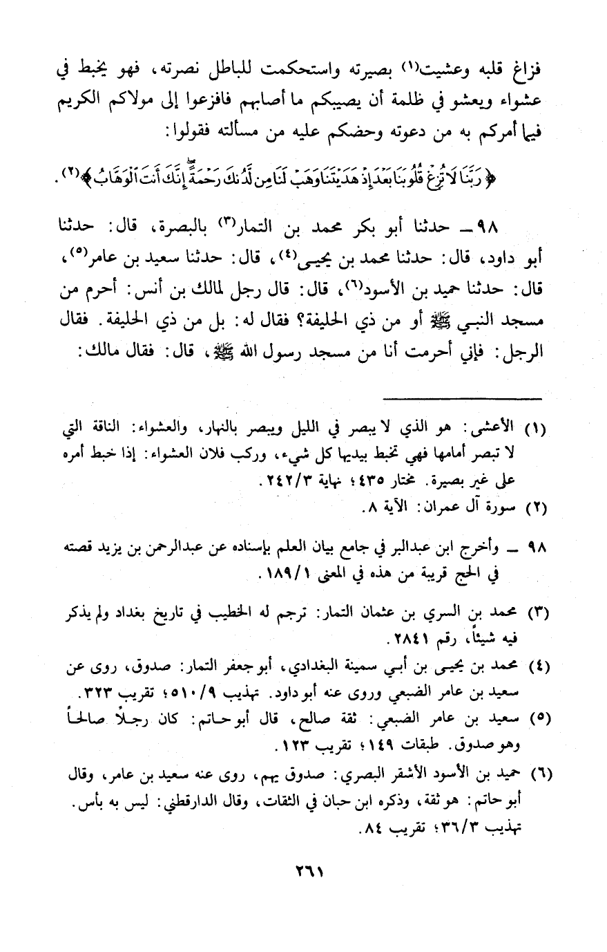 98 - حَدَّثَنَا أَبُو بَكْرٍ مُحَمَّدُ بْنُ التَّمَّارِ، بِالْبَصْرَةِ، قَالَ: حَدَّثَنَا أَبُو دَاوُدَ، قَالَ: حَدَّثَنَا مُحَمَّدُ بْنُ يَحْيَى، قَالَ: حَدَّثَنَا سَعِيدُ بْنُ عَامِرٍ، قَالَ: حَدَّثَنَا حُمَيْدُ بْنُ الْأَسْوَدِ، قَالَ: قَالَ رَجُلٌ لِمَالِكِ بْنِ أَنَسٍ: أُحْرِمُ مِنْ مَسْجِدِ النَّبِيِّ صَلَّى اللَّهُ عَلَيْهِ وَسَلَّمَ أَوْ مِنْ ذِي الْحُلَيْفَةِ؟، فَقَالَ لَهُ: «بَلْ مِنْ ذِي الْحُلَيْفَةِ»، فَقَالَ الرَّجُلُ: فَإِنِّي أَحْرَمْتُ أَنَا مِنْ مَسْجِدِ رَسُولِ اللَّهِ صَلَّى اللَّهُ عَلَيْهِ وَسَلَّمَ قَالَ: فَقَالَ مَالِكٌ: -[262]- " {§فَلْيَحْذَرِ الَّذِينَ يُخَالِفُونَ عَنْ أَمْرِهِ أَنْ تُصِيبَهُمْ فِتْنَةٌ أَوْ يُصِيبَهُمْ عَذَابٌ أَلِيمٌ} [النور: 63] "