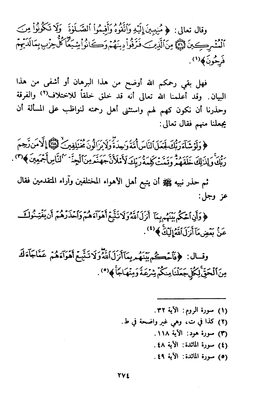 وَقَالَ تَعَالَى: {مُنِيبِينَ إِلَيْهِ وَاتَّقُوهُ وَأَقِيمُوا الصَّلَاةَ وَلَا تَكُونُوا مِنَ الْمُشْرِكِينَ مِنَ الَّذِينَ فَرَّقُوا دِينَهُمْ وَكَانُوا شِيَعًا كُلُّ حِزْبٍ بِمَا لَدَيْهِمْ فَرِحُونَ} [الروم: 31] فَهَلْ بَقِيَ رَحِمَكُمُ اللَّهُ أَوْضَحُ مِنْ هَذَا الْبُرْهَانِ أَوْ أَشْفَى مِنْ هَذَا الْبَيَانِ، وَقَدْ أَعْلَمَنَا اللَّهُ تَعَالَى أَنَّهُ قَدْ خَلَقَ خَلْقًا لِلِاخْتِلَافِ وَالْفُرْقَةِ، وَحَذَّرْنَا أَنْ نَكُونَ كُهْمٌ لَهُمْ، وَاسْتَثْنَى أَهْلَ رَحْمَتِهِ لِنُوَاظِبَ عَلَى الْمَسْأَلَةِ أَنْ يَجْعَلَنَا مِنْهُمْ فَقَالَ تَعَالَى: {وَلَوْ شَاءَ رَبُّكَ لَجَعَلَ النَّاسَ أُمَّةً وَاحِدَةً وَلَا يَزَالُونَ مُخْتَلِفِينَ إِلَّا مَنْ رَحِمَ رَبُّكَ وَلِذَلِكَ خَلَقَهُمْ وَتَمَّتْ كَلِمَةُ رَبِّكَ لَأَمْلَأَنَّ جَهَنَّمَ مِنَ الْجِنَّةِ وَالنَّاسِ أَجْمَعِينَ} [هود: 118] ثُمَّ حَذَّرَ نَبِيَّهُ صَلَّى اللَّهُ عَلَيْهِ وَسَلَّمَ أَنْ يَتَّبِعَ أَهْلَ الْأَهْوَاءِ الْمُخْتَلِفِينَ وَآرَاءَ الْمُتَقَدِّمِينَ، فَقَالَ عَزَّ وَجَلَّ: {وَأَنِ احْكُمْ بَيْنَهُمْ بِمَا أَنْزَلَ اللَّهُ وَلَا تَتَّبِعْ أَهْوَاءَهُمْ وَاحْذَرْهُمْ أَنْ يَفْتِنُوكَ عَنْ بَعْضِ مَا أَنْزَلَ اللَّهُ إِلَيْكَ} [المائدة: 49]، وَقَالَ: {فَاحْكُمْ بَيْنَهُمْ بِمَا أَنْزَلَ اللَّهُ وَلَا تَتَّبِعْ أَهْوَاءَهُمْ عَمَّا جَاءَكَ مِنَ الْحَقِّ لِكُلٍّ جَعَلْنَا مِنْكُمْ شِرْعَةً وَمِنْهَاجًا} [المائدة: 48]،