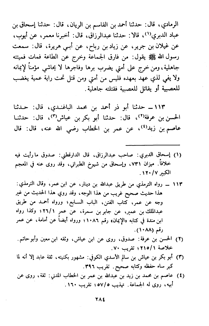 113 - حَدَّثَنَا أَبُو ذَرٍّ أَحْمَدُ بْنُ مُحَمَّدٍ الْبَاغَنْدِيُّ، قَالَ: حَدَّثَنَا الْحَسَنُ بْنُ عَرَفَةَ، قَالَ: حَدَّثَنَا أَبُو بَكْرِ بْنُ عَيَّاشٍ، قَالَ: حَدَّثَنَا عَاصِمُ بْنُ زَيْدٍ، عَنْ عُمَرَ بْنِ الْخَطَّابِ رَضِيَ اللَّهُ عَنْهُ، قَالَ: قَالَ -[285]- رَسُولُ اللَّهِ صَلَّى اللَّهُ عَلَيْهِ وَسَلَّمَ: «§مَنْ أَرَادَ بُحْبُوحَةَ الْجَنَّةِ، فَلْيَلْزَمِ الْجَمَاعَةَ، فَإِنَّ الشَّيْطَانَ مَعَ الْوَاحِدِ وَهُوَ مِنَ الِاثْنَيْنِ أَبْعَدُ»