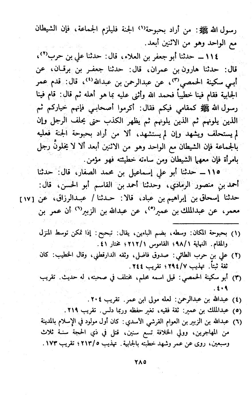 114 - حَدَّثَنَا أَبُو جَعْفَرِ بْنُ الْعَلَاءِ، قَالَ: حَدَّثَنَا عَلِيُّ بْنُ حَرْبٍ، قَالَ: حَدَّثَنَا هَارُونُ بْنُ عِمْرَانَ، قَالَ: حَدَّثَنَا جَعْفَرُ بْنُ بُرْقَانَ، عَنْ أَبِي سُكَيْنَةَ الْحِمْصِيِّ، عَنْ عَبْدِ الرَّحْمَنِ بْنِ عَبْدِ اللَّهِ، قَالَ: قَدِمَ عُمَرُ الْجَابِيَةَ فَقَامَ فِينَا خَطِيبًا، فَحَمِدَ اللَّهَ، وَأَثْنَى عَلَيْهِ بِمَا هُوَ أَهْلُهُ، ثُمَّ قَالَ: قَامَ فِينَا رَسُولُ اللَّهِ صَلَّى اللَّهُ عَلَيْهِ وَسَلَّمَ كَمَقَامِي فِيكُمْ، فَقَالَ: «§أَكْرِمُوا أَصْحَابِي، فَإِنَّهُمْ خِيَارُكُمْ، ثُمَّ الَّذِينَ يَلُونَهُمْ، ثُمَّ الَّذِينَ يَلُونَهُمْ، ثُمَّ يَظْهَرُ الْكَذِبُ حَتَّى يَحْلِفَ الرَّجُلُ، وَإِنْ لَمْ يُسْتَحْلَفْ، وَيَشْهَدَ، وَإِنْ لَمْ يُسْتَشْهَدْ أَلَا مَنْ أَرَادَ بُحْبُوحَةَ الْجَنَّةِ، فَعَلَيْهِ بِالْجَمَاعَةِ، فَإِنَّ الشَّيْطَانَ مَعَ الْوَاحِدِ، وَهُوَ مِنَ الِاثْنَيْنِ أَبْعَدُ، أَلَا لَا يَخْلُوَنَّ رَجُلٌ بِامْرَأَةٍ، فَإِنَّ مَعَهُمَا الشَّيْطَانُ وَمَنْ سَاءَتْهُ خَطِيئَتُهُ فَهُوَ مُؤْمِنٌ»