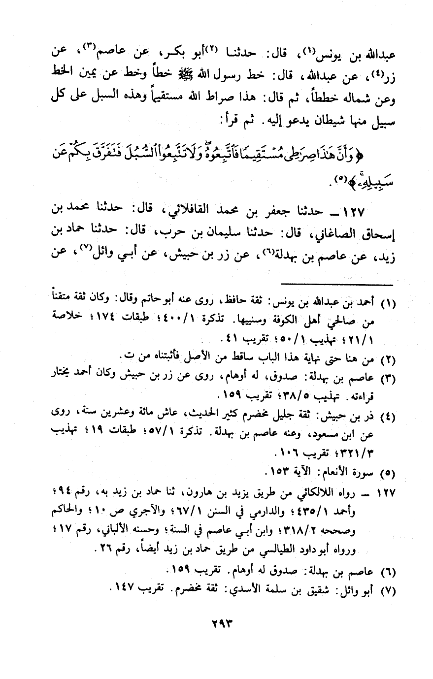 127 - حَدَّثَنَا جَعْفَرُ بْنُ مُحَمَّدٍ الْقَافْلَائِيُّ، قَالَ: حَدَّثَنَا مُحَمَّدُ بْنُ إِسْحَاقَ الصَّاغَانِيُّ، قَالَ: حَدَّثَنَا سُلَيْمَانُ بْنُ حَرْبٍ، قَالَ: حَدَّثَنَا حَمَّادُ بْنُ زَيْدٍ، عَنْ عَاصِمِ بْنِ بَهْدَلَةَ، عَنْ زِرِّ بْنِ حُبَيْشٍ، عَنْ أَبِي وَائِلٍ، عَنْ -[294]- عَبْدِ اللَّهِ، قَالَ: خَطَّ لَنَا رَسُولُ اللَّهِ صَلَّى اللَّهُ عَلَيْهِ وَسَلَّمَ يَوْمًا خَطًّا، فَقَالَ: «هَذَا سَبِيلُ اللَّهِ» ثُمَّ خَطَّ خُطُوطًا عَنْ يَمِينِ الْخَطِّ وَيَسَارِهِ، وَقَالَ: § «هَذِهِ سُبُلٌ عَلَى كُلِّ سَبِيلٍ مِنْهَا شَيْطَانٌ يَدْعُو إِلَيْهِ» ثُمَّ تَلَا: {وَأَنَّ هَذَا صِرَاطِي مُسْتَقِيمًا فَاتَّبِعُوهُ وَلَا تَتَّبِعُوا السُّبُلَ} [الأنعام: 153] فَتَفَرَّقَ بِكُمْ عَنْ سَبِيلِهِ ذَلِكُمْ وَصَّاكُمْ بِهِ لَعَلَّكُمْ تَتَّقُونَ يَعْنِي الْخُطُوطَ الَّتِي عَنْ يَسَارِهِ وَيَمِينِهِ