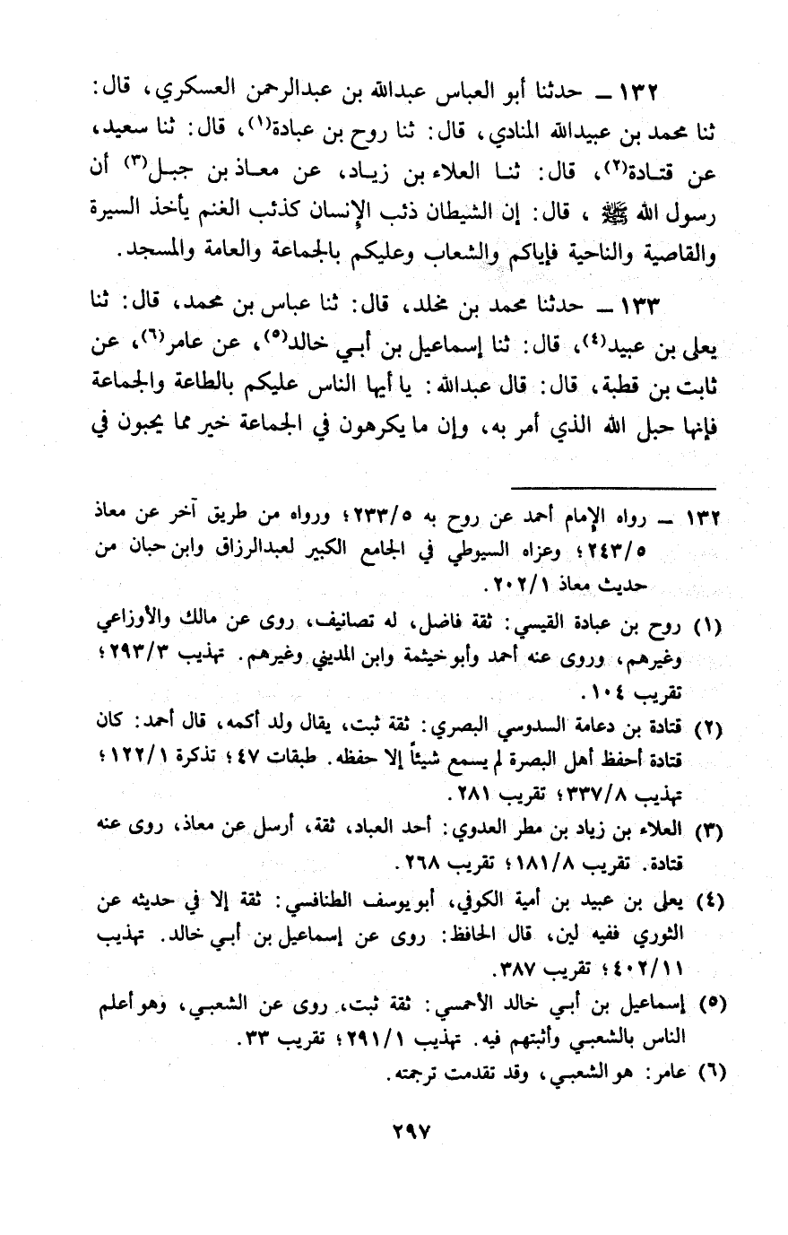 132 - حَدَّثَنَا أَبُو الْعَبَّاسِ عَبْدُ اللَّهِ بْنُ عَبْدِ الرَّحْمَنِ الْعَسْكَرِيُّ، قَالَ: ثنا مُحَمَّدُ بْنُ عُبَيْدِ اللَّهِ الْمُنَادِي، قَالَ: ثنا رَوْحُ بْنُ عُبَادَةَ، قَالَ: ثنا سَعِيدٌ، عَنْ قَتَادَةَ، قَالَ: ثنا الْعَلَاءُ بْنُ زِيَادٍ، عَنْ مُعَاذِ بْنِ جَبَلٍ، أَنَّ رَسُولَ اللَّهِ صَلَّى اللَّهُ عَلَيْهِ وَسَلَّمَ قَالَ: «إِنَّ §الشَّيْطَانَ ذِئْبُ الْإِنْسَانِ كَذِئْبِ الْغَنَمِ، يَأْخُذُ السَّيْرَةَ وَالْقَاصِيَةَ وَالنَّاحِيَةَ، فَإِيَّاكُمْ وَالشِّعَابَ، وَعَلَيْكُمْ بِالْجَمَاعَةِ وَالْعَامَّةِ وَالْمَسْجِدِ»