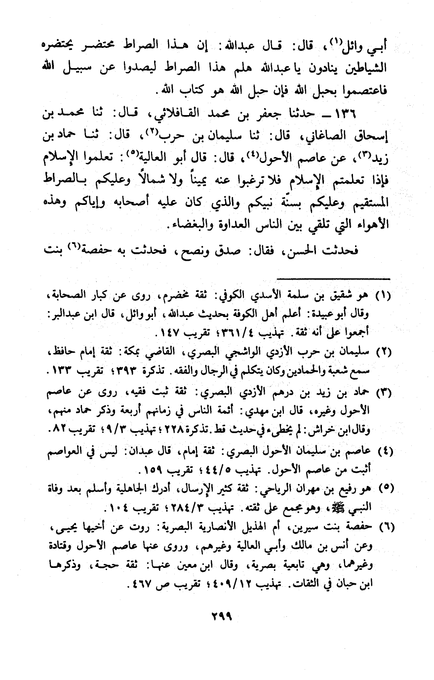 136 - حَدَّثَنَا جَعْفَرُ بْنُ مُحَمَّدٍ الْقَافْلَائِيُّ، قَالَ: ثنا مُحَمَّدُ بْنُ إِسْحَاقَ الصَّاغَانِيُّ، قَالَ: ثنا سُلَيْمَانُ بْنُ حَرْبٍ، قَالَ: ثنا حَمَّادُ بْنُ زَيْدٍ، عَنْ عَاصِمٍ الْأَحْوَلِ، قَالَ: قَالَ أَبُو الْعَالِيَةِ: " §تَعَلَّمُوا الْإِسْلَامَ، فَإِذَا تَعَلَّمْتُمُ الْإِسْلَامَ فَلَا تَرْغَبُوا عَنْهُ يَمِينًا وَلَا شِمَالًا، وَعَلَيْكُمْ بِالصِّرَاطِ الْمُسْتَقِيمِ، وَعَلَيْكُمْ بِسُنَّةِ نَبِيِّكُمْ، وَالَّذِي كَانَ عَلَيْهِ أَصْحَابُهُ، وَإِيَّاكُمْ وَهَذِهِ الْأَهْوَاءَ الَّتِي تُلْقِي بَيْنَ النَّاسِ الْعَدَاوَةَ وَالْبَغْضَاءَ، فَحَدَّثْتُ الْحَسَنَ، فَقَالَ: صَدَقَ وَنَصَحَ، فَحَدَّثْتُ بِهِ حَفْصَةَ بِنْتَ -[300]- سِيرِينَ، فَقَالَتْ: يَا بُنَيَّ أَنْتَ حَدَّثْتَ بِهَذَا مُحَمَّدًا؟ قُلْتُ: لَا، قَالَتْ: فَحَدِّثْهُ إِذًا