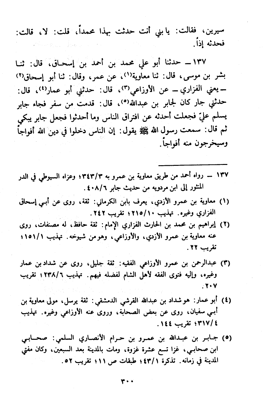 137 - حَدَّثَنَا أَبُو عَلِيٍّ مُحَمَّدُ بْنُ أَحْمَدَ بْنِ إِسْحَاقَ، قَالَ: ثنا بِشْرُ بْنُ مُوسَى، قَالَ: ثنا مُعَاوِيَةُ بْنُ عَمْرٍو قَالَ: ثنا أَبُو إِسْحَاقَ يَعْنِي الْفَزَارِيَّ، عَنِ الْأَوْزَاعِيِّ، قَالَ: حَدَّثَنِي أَبُو عَمَّارٍ، قَالَ: حَدَّثَنِي جَارٌ، كَانَ لِجَابِرِ بْنِ عَبْدِ اللَّهِ قَالَ: قَدِمْتُ مِنْ سَفَرٍ، فَجَاءَ جَابِرٌ يُسَلِّمُ عَلَيَّ فَجَعَلْتُ أُحَدِّثُهُ عَنِ افْتِرَاقِ النَّاسِ، وَمَا أَحْدَثُوا، فَجَعَلَ جَابِرٌ يَبْكِي، ثُمَّ قَالَ: سَمِعْتُ رَسُولَ اللَّهِ صَلَّى اللَّهُ عَلَيْهِ وَسَلَّمَ يَقُولُ: «إِنَّ §النَّاسَ دَخَلُوا فِي دِينِ اللَّهِ أَفْوَاجًا، وَسَيَخْرُجُونَ مِنْهُ أَفْوَاجًا»
