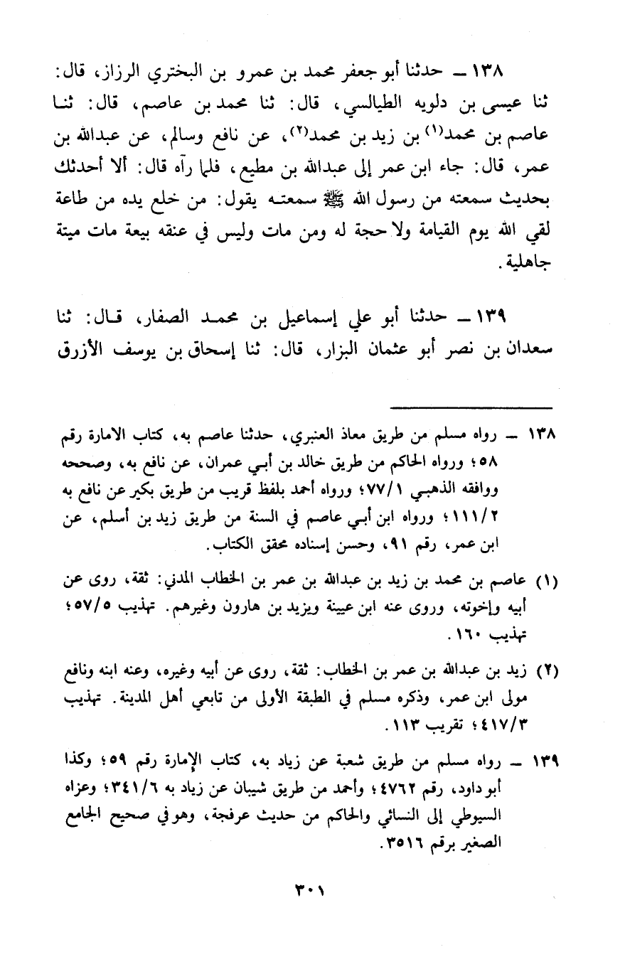 138 - حَدَّثَنَا أَبُو جَعْفَرٍ مُحَمَّدُ بْنُ عَمْرِو بْنِ الْبَخْتَرِيِّ الرَّزَّازُ، قَالَ: ثنا عِيسَى بْنُ دَلَوَيْهِ الطَّيَالِسِيُّ، قَالَ: ثنا مُحَمَّدُ بْنُ عَاصِمٍ، قَالَ: ثنا عَاصِمُ بْنُ مُحَمَّدِ بْنِ زَيْدِ بْنِ مُحَمَّدٍ، عَنْ نَافِعٍ، وَسَالِمٍ، عَنْ عَبْدِ اللَّهِ بْنِ عُمَرَ، قَالَ: جَاءَ ابْنُ عُمَرَ إِلَى عَبْدِ اللَّهِ بْنِ مُطِيعٍ، فَلَمَّا رَآهُ قَالَ: أَلَا أُحَدِّثُكَ بِحَدِيثٍ سَمِعْتُهُ مِنْ رَسُولِ اللَّهِ صَلَّى اللَّهُ عَلَيْهِ وَسَلَّمَ، سَمِعْتُهُ يَقُولُ: § «مَنْ خَلَعَ يَدَهُ مِنْ طَاعَةٍ لَقِيَ اللَّهَ يَوْمَ الْقِيَامَةِ وَلَا حُجَّةَ لَهُ، وَمَنْ مَاتَ وَلَيْسَ فِي عُنُقِهِ بَيْعَةٌ مَاتَ مِيتَةً جَاهِلِيَّةً»
