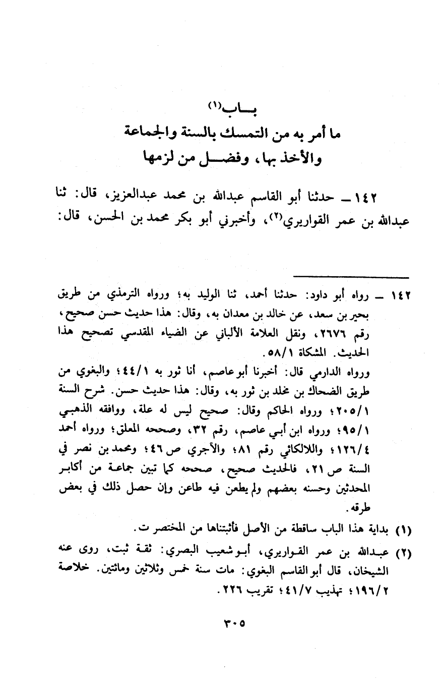 142 - حَدَّثَنَا أَبُو الْقَاسِمِ عَبْدُ اللَّهِ بْنُ مُحَمَّدِ بْنِ عَبْدِ الْعَزِيزِ، قَالَ: ثنا عُبَيْدُ اللَّهِ بْنُ عُمَرَ الْقَوَارِيرِيُّ، وَأَخْبَرَنِي أَبُو بَكْرٍ مُحَمَّدُ بْنُ الْحَسَنِ، قَالَ: -[306]- أَخْبَرَنَا إِبْرَاهِيمُ بْنُ مُوسَى الْجَوْزِيُّ، قَالَ: ثنا دَاوُدُ بْنُ رُشَيْدٍ، قَالَ: ثنا الْوَلِيدُ بْنُ مُسْلِمٍ، قَالَ: ثنا ثَوْرُ بْنُ يَزِيدَ، قَالَ: حَدَّثَنِي خَالِدُ بْنُ مَعْدَانَ، قَالَ: حَدَّثَنِي عَبْدُ الرَّحْمَنِ بْنُ عَمْرٍو السُّلَمِيُّ، وَحُجْرُ بْنُ حُجْرٍ الْكَلَاعِيُّ، قَالَا: أَتَيْنَا الْعِرْبَاضَ بْنَ سَارِيَةَ، وَكَانَ مِنَ الَّذِينَ أَنْزَلَ اللَّهُ فِيهِمْ: -[307]- {وَلَا عَلَى الَّذِينَ إِذَا مَا أَتَوْكَ لِتَحْمِلَهُمْ قُلْتَ لَا أَجِدُ مَا أَحْمِلُكُمْ عَلَيْهِ} [التوبة: 92] فَدَخَلْنَا فَسَلَّمْنَا عَلَيْهِ، فَقُلْنَا: أَتَيْنَاكَ زَائِرِينَ، وَعَائِدِينَ، وَمُقْتَبِسِينَ، فَقَالَ: صَلَّى بِنَا رَسُولُ اللَّهِ صَلَّى اللَّهُ عَلَيْهِ وَسَلَّمَ الصُّبْحَ ذَاتَ يَوْمٍ، ثُمَّ أَقْبَلَ عَلَيْنَا فَوَعَظَنَا مَوْعِظَةً بَلِيغَةً ذَرَفَتْ مِنْهَا الْعُيُونُ، وَوَجِلَتْ مِنْهَا الْقُلُوبُ، فَقَالَ قَائِلٌ: يَا رَسُولَ اللَّهِ كَأَنَّهَا مَوْعِظَةُ مُوَدِّعٍ، فَمَاذَا تَعْهَدُ إِلَيْنَا؟، فَقَالَ: «§أُوصِيكُمْ بِتَقْوَى اللَّهِ، وَالسَّمْعِ وَالطَّاعَةِ، وَإِنْ كَانَ عَبْدًا حَبَشِيًّا، فَإِنَّهُ مَنْ يَعِشْ بَعْدِي، فَسَيَرَى اخْتِلَافًا كَثِيرًا، فَعَلَيْكُمْ بِسُنَّتِي، وَسُنَّةِ الْخُلَفَاءِ الرَّاشِدِينَ الْمَهْدِيِّينَ، فَتَمَسَّكُوا بِهَا، وَعَضُّوا عَلَيْهَا بِالنَّوَاجِذِ، وَإِيَّاكُمْ وَمُحْدَثَاتِ الْأُمُورِ، فَإِنَّ كُلَّ مُحْدَثَةٍ بِدْعَةٌ، وَكُلَّ بِدْعَةٍ ضَلَالَةٌ»