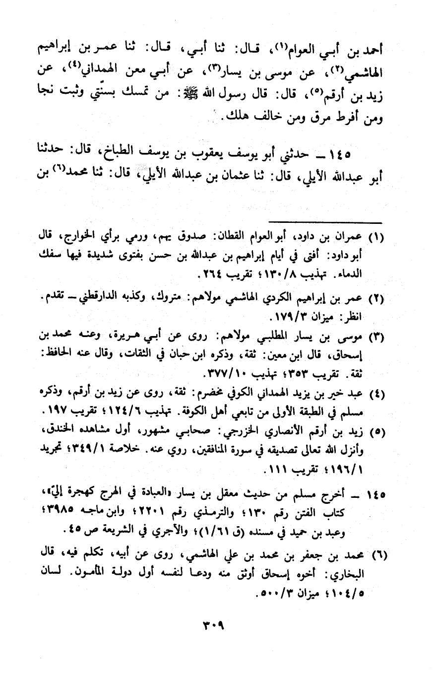 145 - حَدَّثَنِي أَبُو يُوسُفَ يَعْقُوبُ بْنُ يُوسُفَ الطَّبَّاخُ، قَالَ: حَدَّثَنَا أَبُو عَبْدِ اللَّهِ الْأَيْلِيُّ، قَالَ: ثنا عُثْمَانُ بْنُ عَبْدِ اللَّهِ الْأَيْلِيُّ، قَالَ: ثنا مُحَمَّدُ بْنُ -[310]- جَعْفَرٍ الطَّالِبِيُّ، عَنْ أَبِيهِ، عَنْ جَدِّهِ، عَنْ عَلِيِّ بْنِ أَبِي طَالِبٍ، قَالَ: قَالَ رَسُولُ اللَّهِ صَلَّى اللَّهُ عَلَيْهِ وَسَلَّمَ: § «الْمُتَمَسِّكُ بِسُنَّتِي فِي دِينِهِ فِي الْهَرْجِ لَهُ أَجْرُ مِائَةِ شَهِيدٍ»