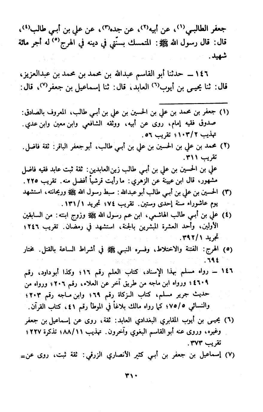 146 - حَدَّثَنَا أَبُو الْقَاسِمِ عَبْدُ اللَّهِ بْنُ مُحَمَّدِ بْنِ مُحَمَّدِ بْنِ عَبْدِ الْعَزِيزِ، قَالَ: ثنا يَحْيَى بْنُ أَيُّوبَ الْعَابِدُ، قَالَ: ثنا إِسْمَاعِيلُ بْنُ جَعْفَرٍ، قَالَ: -[311]- أَخْبَرَنِي الْعَلَاءُ بْنُ عَبْدِ الرَّحْمَنِ، عَنْ أَبِيهِ، عَنْ أَبِي هُرَيْرَةَ، أَنَّ رَسُولَ اللَّهِ صَلَّى اللَّهُ عَلَيْهِ وَسَلَّمَ قَالَ: § «مَنْ دَعَا إِلَى الْهُدَى كَانَ لَهُ مِنَ الْأَجْرِ مِثْلُ أُجُورِ مَنْ تَبِعَهُ لَا يَنْقُصُ ذَلِكَ مِنْ أُجُورِهِمْ شَيْئًا، وَمَنْ دَعَا إِلَى ضَلَالَةٍ كَانَ عَلَيْهِ مِنَ الْإِثْمِ مِثْلُ آثَامِ مَنْ تَبِعَهُ لَا يَنْقُصُ ذَلِكَ مِنْ آثَامِهِمْ شَيْئًا»
