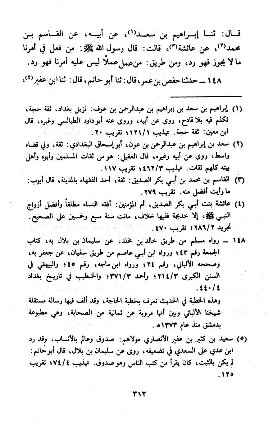 148 - حَدَّثَنَا حَفْصُ بْنُ عُمَرَ، قَالَ: ثنا أَبُو حَاتِمٍ، قَالَ: ثنا ابْنُ عُفَيْرٍ، -[313]- قَالَ: حَدَّثَنِي سُلَيْمَانُ بْنُ بِلَالٍ، عَنْ جَعْفَرِ بْنِ مُحَمَّدٍ، عَنْ أَبِيهِ، عَنْ جَابِرِ بْنِ عَبْدِ اللَّهِ، أَنَّهُ سَمِعَهُ يَقُولُ: خَطَبَ النَّبِيُّ صَلَّى اللَّهُ عَلَيْهِ وَسَلَّمَ يَوْمَ الْجُمُعَةِ يَحْمَدُ اللَّهَ وَيُثْنِي عَلَيْهِ، ثُمَّ يَقُولُ عَلَى إِثْرِ ذَلِكَ، وَقَدْ عَلَا صَوْتُهُ، وَاشْتَدَّ غَضَبُهُ، وَاحْمَرَّتْ وَجْنَتَاهُ كَأَنَّهُ مُنْذِرُ جَيْشٍ يَقُولُ: «صَبَّحَكُمْ أَوْ مَسَّاكُمْ»، ثُمَّ قَالَ: «§بُعِثْتُ أَنَا وَالسَّاعَةَ كَهَاتَيْنِ» وَأَشَارَ بِأُصْبُعَيْهِ الْوُسْطَى، وَالَّتِي تَلِي الْإِبْهَامَ. ثُمَّ قَالَ: «إِنَّ أَفْضَلَ الْحَدِيثِ كِتَابُ اللَّهِ، وَخَيْرَ الْهَدْيِ هَدْيُ مُحَمَّدٍ، وَشَرَّ الْأُمُورِ مُحْدَثَاتُهَا، وَكُلَّ بِدْعَةٍ ضَلَالَةٌ»