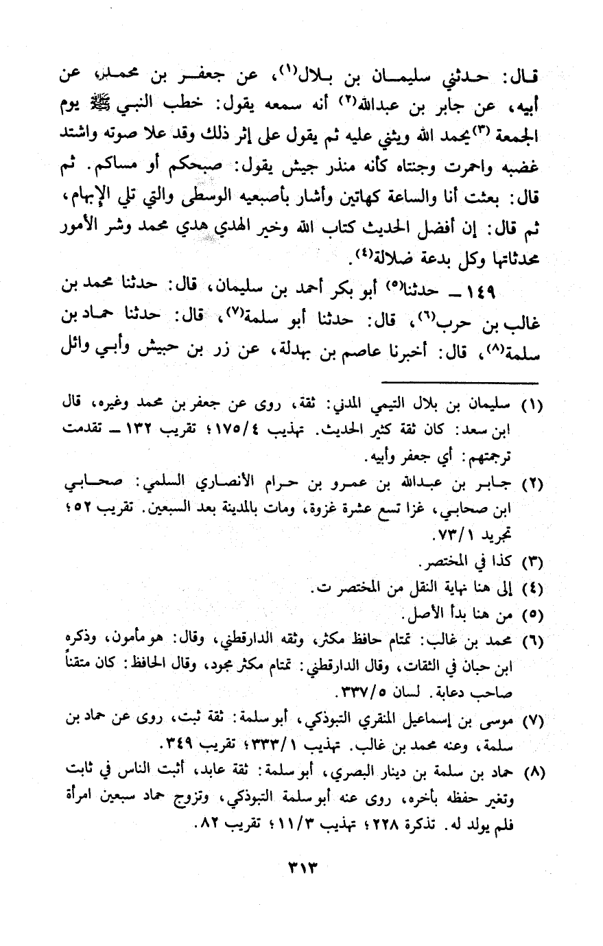149 - حَدَّثَنَا أَبُو بَكْرٍ أَحْمَدُ بْنُ سُلَيْمَانَ، قَالَ: حَدَّثَنَا مُحَمَّدُ بْنُ غَالِبِ بْنِ حَرْبٍ، قَالَ: حَدَّثَنَا أَبُو سَلَمَةَ، قَالَ: حَدَّثَنَا حَمَّادُ بْنُ سَلَمَةَ، قَالَ: أَخْبَرَنَا عَاصِمُ بْنُ بَهْدَلَةَ، عَنْ زِرِّ بْنِ حُبَيْشٍ، وَأَبِي وَائِلٍ، -[314]- أَنَّ نَاسًا صَحِبُوا أَبَا مَسْعُودٍ الْبَدْرِيَّ، قَالَ ابْنُ سُلَيْمَانَ: وَحَدَّثَنِي ابْنُ عُثْمَانَ، قَالَ: حَدَّثَنَا أَبِي، عَنْ يَعْلَى بْنِ عُبَيْدٍ، عَنْ أَيُّوبَ، عَنْ أَبِي يَحْيَى الْأَنْصَارِيِّ، عَنْ أَبِي مَسْعُودٍ، قَالَ: «§عَلَيْكُمْ بِتَقْوَى اللَّهِ، وَهَذِهِ الْجَمَاعَةِ، فَإِنَّ اللَّهَ لَا يَجْمَعُ أُمَّةَ مُحَمَّدٍ عَلَى ضَلَالَةٍ أَبَدًا، وَعَلَيْكُمْ بِالصَّبْرِ حَتَّى يَسْتَرِيحَ بَرٌّ أَوْ يُسْتَرَاحَ مِنْ فَاجِرٍ». «وَلَفْظُ الْحَدِيثِ لِمُحَمَّدِ بْنِ غَالِبٍ»