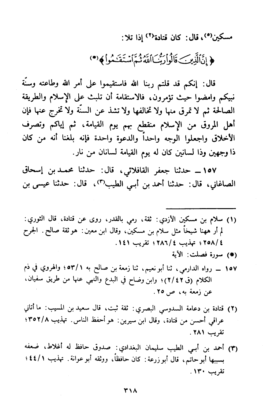 157 - حَدَّثَنَا جَعْفَرٌ الْقَافْلَائِيُّ، قَالَ: حَدَّثَنَا مُحَمَّدُ بْنُ إِسْحَاقَ الصَّاغَانِيُّ، قَالَ: حَدَّثَنَا أَحْمَدُ بْنُ أَبِي الطَّيِّبِ، قَالَ: حَدَّثَنَا عِيسَى بْنُ -[319]- يُونُسَ، عَنْ زَمْعَةَ بْنِ صَالِحٍ، عَنْ عُثْمَانَ بْنِ حَاضِرٍ الْأَزْدِيِّ، قَالَ: دَخَلْتُ عَلَى ابْنِ عَبَّاسٍ، فَقُلْتُ: أَوْصِنِي، فَقَالَ: «§عَلَيْكَ بِالِاسْتِقَامَةِ، اتَّبِعْ وَلَا تَبْتَدِعْ»