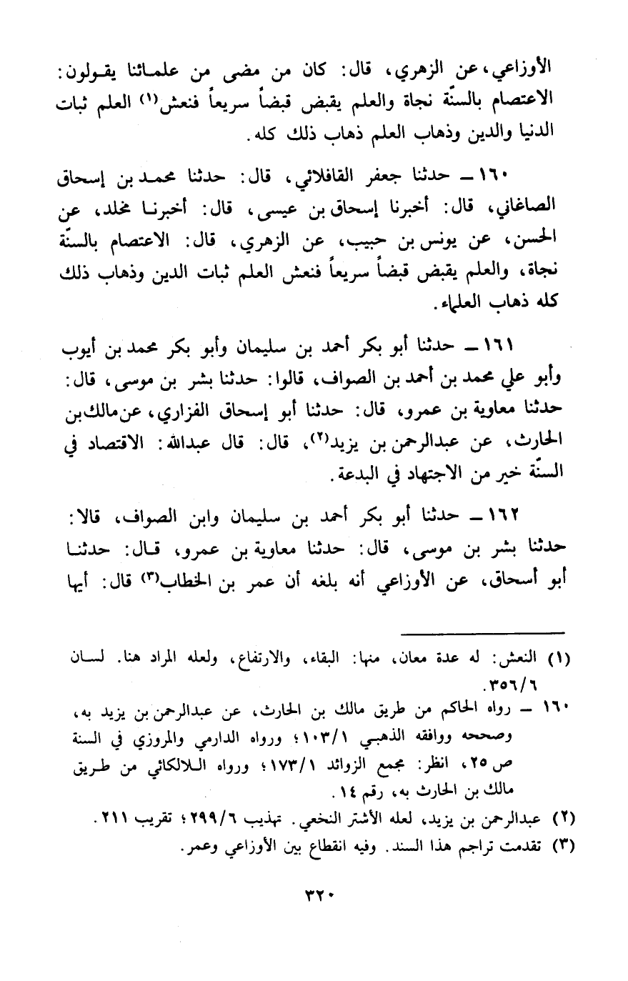 160 - حَدَّثَنَا جَعْفَرٌ الْقَافْلَائِيُّ، قَالَ: حَدَّثَنَا مُحَمَّدُ بْنُ إِسْحَاقَ الصَّاغَانِيُّ، قَالَ: أَخْبَرَنَا إِسْحَاقُ بْنُ عِيسَى، قَالَ: أَخْبَرَنَا مَخْلَدٌ، عَنِ الْحَسَنِ، عَنْ يُونُسَ بْنِ حَبِيبٍ، عَنِ الزُّهْرِيِّ، قَالَ: «§الِاعْتِصَامُ بِالسُّنَّةِ نَجَاةٌ، وَالْعِلْمُ يُقْبَضُ قَبْضًا سَرِيعًا، فَنَعْشُ الْعِلْمِ ثَبَاتُ الدِّينِ، وَذَهَابُ ذَلِكَ كُلِّهُ ذَهَابُ الْعُلَمَاءِ»