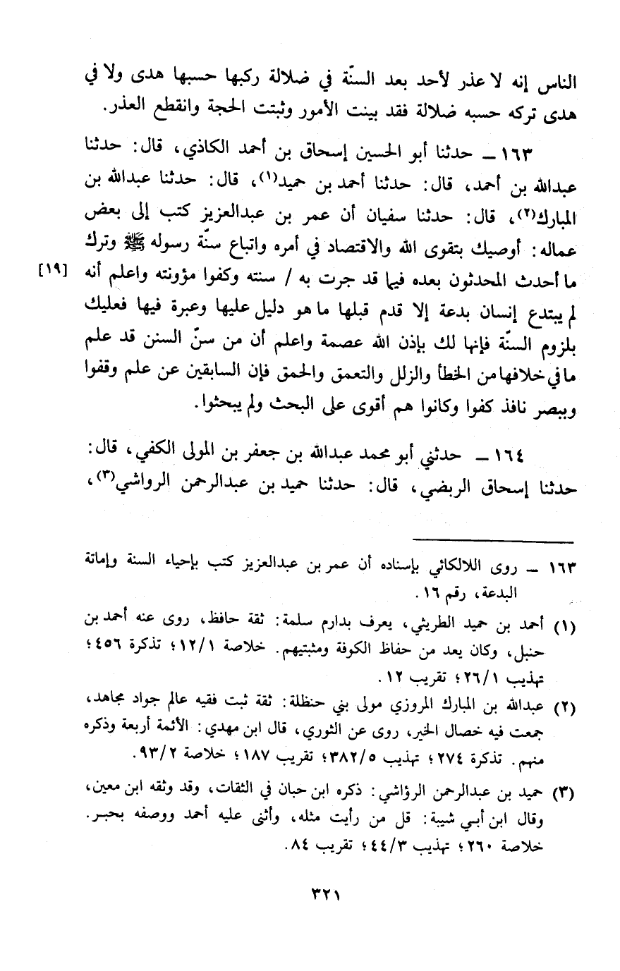 163 - حَدَّثَنَا أَبُو الْحُسَيْنِ إِسْحَاقُ بْنُ أَحْمَدَ الْكَاذِيُّ، قَالَ: حَدَّثَنَا عَبْدُ اللَّهِ بْنُ أَحْمَدَ، قَالَ: حَدَّثَنَا أَحْمَدُ بْنُ حُمَيْدٍ، قَالَ: حَدَّثَنَا عَبْدُ اللَّهِ بْنُ الْمُبَارَكِ، قَالَ: حَدَّثَنَا سُفْيَانُ، أَنَّ عُمَرَ بْنَ عَبْدِ الْعَزِيزِ، كَتَبَ إِلَى بَعْضِ عُمَّالِهِ: «§أُوصِيكَ بِتَقْوَى اللَّهِ، وَالِاقْتِصَادِ فِي أَمْرِهِ، وَاتِّبَاعِ سُنَّةِ رَسُولِهِ صَلَّى اللَّهُ عَلَيْهِ وَسَلَّمَ، وَتَرْكِ مَا أَحْدَثَ الْمُحْدِثُونَ بَعْدَهُ، فِيمَا قَدْ جَرَتْ بِهِ سُنَّتُهُ، وَكُفُوا مَئُونَتَهُ، وَاعْلَمْ أَنَّهُ لَمْ يَبْتَدِعْ إِنْسَانٌ بِدْعَةً، إِلَّا قُدِّمَ قَبْلَهَا مَا هُوَ دَلِيلٌ عَلَيْهَا، وَعِبْرَةٌ فِيهَا فَعَلَيْكَ بِلُزُومِ السُّنَّةِ، فَإِنَّهَا لَكَ بِإِذْنِ اللَّهِ عِصْمَةٌ، وَاعْلَمْ أَنَّ مَنْ سَنَّ السُّنَنَ قَدْ عَلِمَ مَا فِي خِلَافِهَا مِنَ الْخَطَأِ وَالزَّلَلِ، وَالتَّعَمُّقِ وَالْحُمْقِ، فَإِنَّ السَّابِقِينَ عَنْ عِلْمٍ وَقَفُوا، وَبِبَصَرٍ نَافِذٍ كَفُّوا، وَكَانُوا هُمْ أَقْوَى عَلَى الْبَحْثِ، وَلَمْ يَبْحَثُوا»