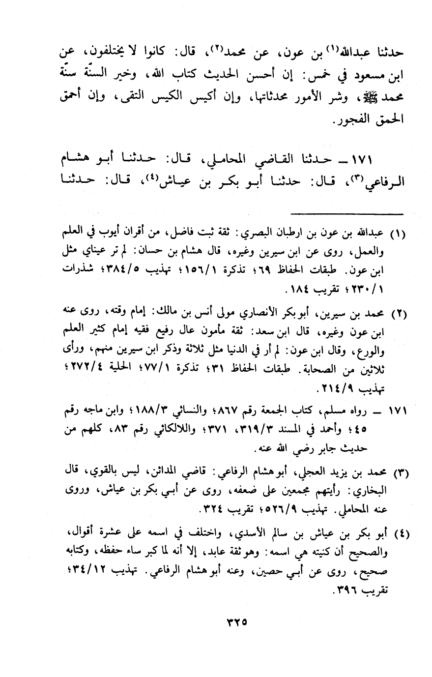 171 - حَدَّثَنَا الْقَاضِي الْمَحَامِلِيُّ، قَالَ: حَدَّثَنَا أَبُو هِشَامٍ الرِّفَاعِيُّ، قَالَ: حَدَّثَنَا أَبُو بَكْرِ بْنُ عَيَّاشٍ، قَالَ: حَدَّثَنَا -[326]- أَبُو حُصَيْنٍ، عَنْ أَبِي صَالِحٍ، عَنْ أَبِي هُرَيْرَةَ، قَالَ: قَالَ رَسُولُ اللَّهِ صَلَّى اللَّهُ عَلَيْهِ وَسَلَّمَ: «إِنَّ §أَحْسَنَ الْحَدِيثِ كِتَابُ اللَّهِ، وَخَيْرَ الْهَدْيِ هَدْيُ مُحَمَّدٍ، وَشَرَّ الْأُمُورِ مُحْدَثَاتُهَا، وَكُلَّ مُحْدَثَةٍ بِدْعَةٌ، وَكُلَّ بِدْعَةٍ ضَلَالَةٌ»