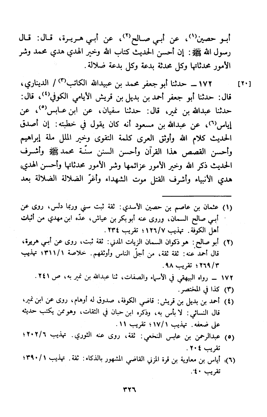 172 - حَدَّثَنَا أَبُو جَعْفَرٍ مُحَمَّدُ بْنُ عُبَيْدِ اللَّهِ الْكَاتِبُ الدِّينَارِيُّ، قَالَ: حَدَّثَنَا أَبُو جَعْفَرٍ أَحْمَدُ بْنُ بُدَيْلِ بْنِ قُرَيْشٍ الْأَيَامِيُّ الْكُوفِيُّ، قَالَ: حَدَّثَنَا عَبْدُ اللَّهِ بْنُ نُمَيْرٍ، قَالَ: حَدَّثَنَا سُفْيَانُ، عَنِ ابْنِ عَابِسٍ، عَنْ إِيَاسٍ، عَنْ عَبْدِ اللَّهِ بْنِ مَسْعُودٍ، أَنَّهُ كَانَ يَقُولُ فِي خُطْبَتِهِ: «إِنَّ §أَصْدَقَ الْحَدِيثِ كَلَامُ اللَّهِ، وَأَوْثَقَ الْعُرَى كَلِمَةُ التَّقْوَى، وَخَيْرَ الْمِلَلِ مِلَّةُ إِبْرَاهِيمَ، وَأَحْسَنَ الْقَصَصِ هَذَا الْقُرْآنُ، وَأَحْسَنَ السُّنَنِ سُنَّةُ مُحَمَّدٍ صَلَّى اللَّهُ عَلَيْهِ وَسَلَّمَ، وَأَشْرَفَ الْحَدِيثِ ذِكْرُ اللَّهِ، وَخَيْرَ الْأُمُورِ عَزَائِمُهَا، وَشَرَّ الْأُمُورِ مُحْدَثَاتُهَا، وَأَحْسَنَ الْهَدْيِ هَدْيُ الْأَنْبِيَاءِ، وَأَشْرَفَ الْقَتْلِ مَوْتُ الشُّهَدَاءِ، وَأَغَرَّ الضَّلَالَةِ الضَّلَالَةُ بَعْدَ -[327]- الْهُدَى، وَخَيْرَ الْعِلْمِ مَا نَفَعَ، وَخَيْرَ الْهُدَى مَا اتُّبِعَ، وَشَرَّ الْعَمَى عَمَى الْقَلْبِ» وَذَكَرَ الْخُطْبَةَ بِطُولِهَا فَاخْتَصَرْتُهَا أَنَا