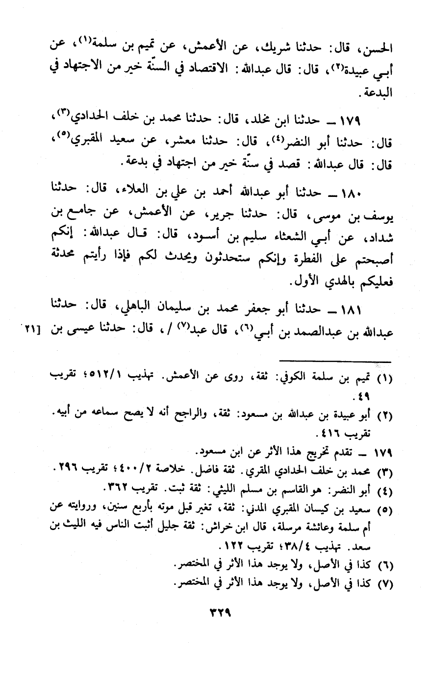 179 - حَدَّثَنَا ابْنُ مَخْلَدٍ، قَالَ: حَدَّثَنَا مُحَمَّدُ بْنُ خَلَفٍ الْحَدَّادِيُّ، قَالَ: حَدَّثَنَا أَبُو النَّضْرِ، قَالَ: حَدَّثَنَا مَعْشَرٌ، عَنْ سَعِيدٍ الْمَقْبُرِيِّ، قَالَ: قَالَ عَبْدُ اللَّهِ: § «قَصْدٌ فِي سُنَّةٍ خَيْرٌ مِنَ اجْتِهَادٍ فِي بِدْعَةٍ»