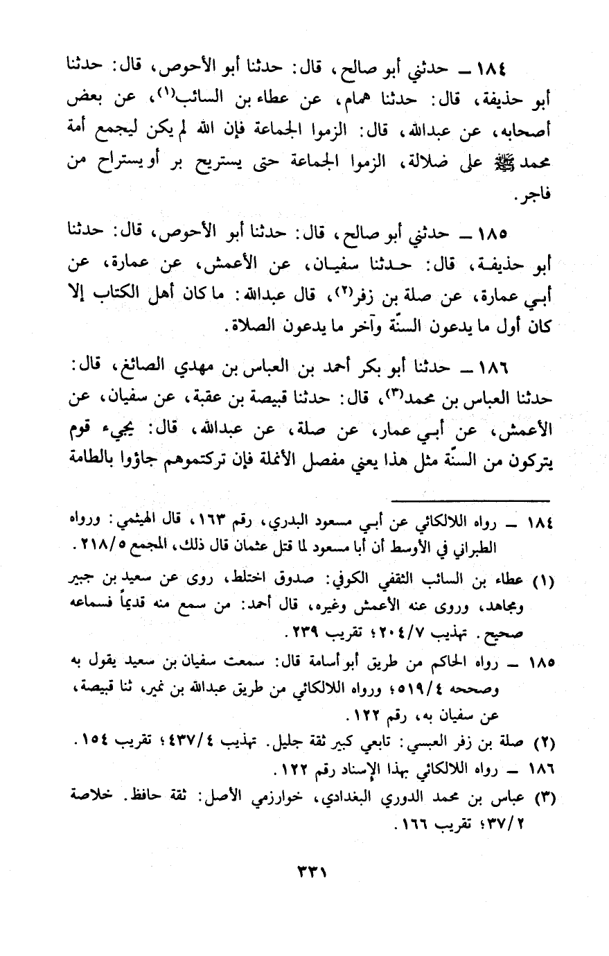 184 - حَدَّثَنِي أَبُو صَالِحٍ، قَالَ: حَدَّثَنَا أَبُو الْأَحْوَصِ، قَالَ: حَدَّثَنَا أَبُو حُذَيْفَةَ، قَالَ: حَدَّثَنَا هَمَّامٌ، عَنْ عَطَاءِ بْنِ السَّائِبِ، عَنْ بَعْضِ، أَصْحَابِهِ، عَنْ عَبْدِ اللَّهِ، قَالَ: «§الْزَمُوا الْجَمَاعَةَ، فَإِنَّ اللَّهَ لَمْ يَكُنْ لِيَجْمَعَ أُمَّةَ مُحَمَّدٍ صَلَّى اللَّهُ عَلَيْهِ وَسَلَّمَ عَلَى ضَلَالَةٍ، الْزَمُوا الْجَمَاعَةَ حَتَّى يَسْتَرِيحَ بَرٌّ، أَوْ يُسْتَرَاحَ مِنْ فَاجِرٍ»