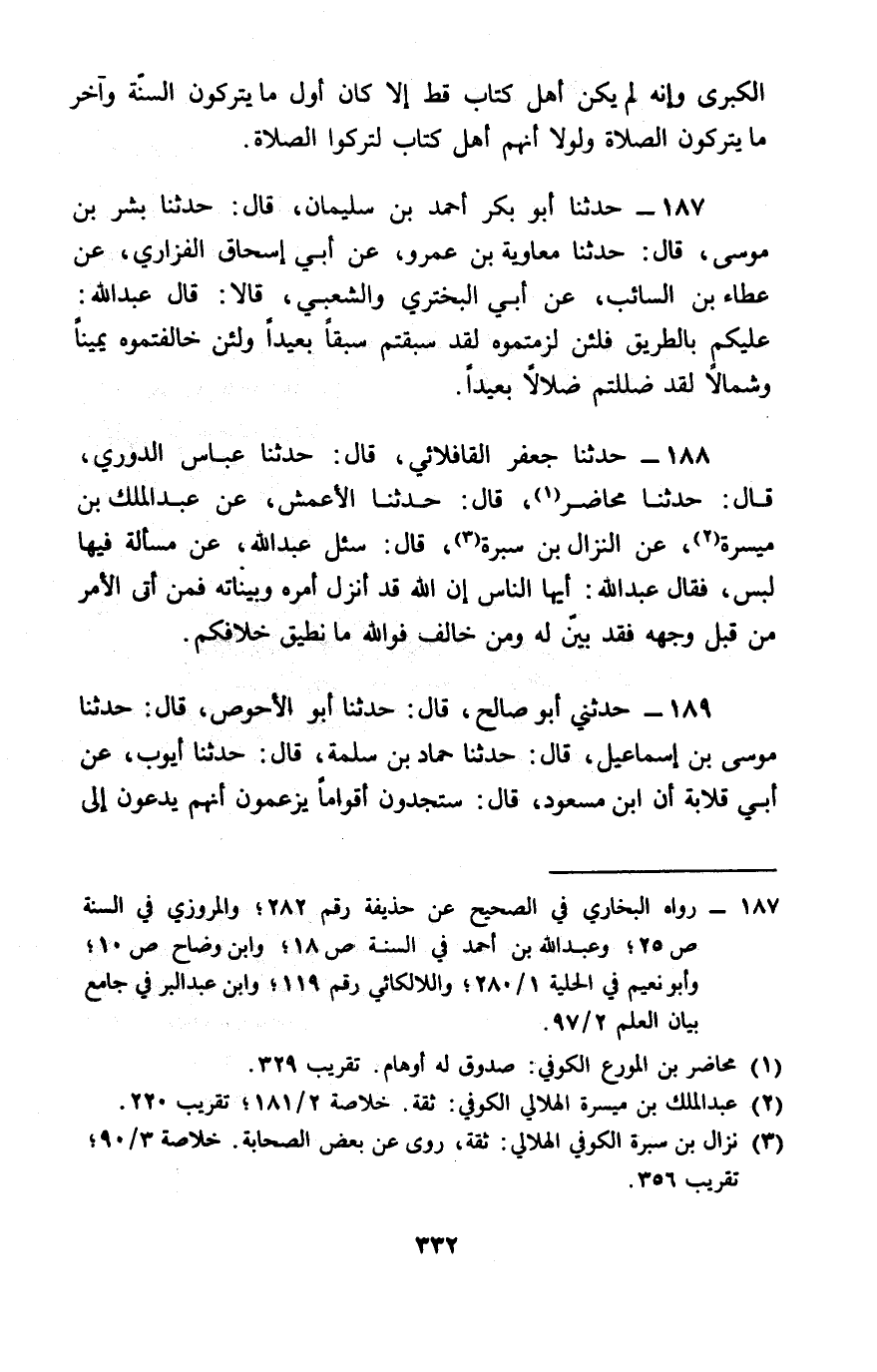 187 - حَدَّثَنَا أَبُو بَكْرٍ أَحْمَدُ بْنُ سُلَيْمَانَ، قَالَ: حَدَّثَنَا بِشْرُ بْنُ مُوسَى، قَالَ: حَدَّثَنَا مُعَاوِيَةُ بْنُ عَمْرٍو، عَنْ أَبِي إِسْحَاقَ الْفَزَارِيِّ، عَنْ عَطَاءِ بْنِ السَّائِبِ، عَنْ أَبِي الْبَخْتَرِيِّ، وَالشَّعْبِيِّ، قَالَا: قَالَ عَبْدُ اللَّهِ: «§عَلَيْكُمْ بِالطَّرِيقِ فَلَئِنْ لَزَمْتُمُوهُ، لَقَدْ سَبَقْتُمْ سَبْقًا بَعِيدًا، وَلَئِنْ خَالَفْتُمُوهُ يَمِينًا، وَشِمَالًا لَقَدْ ضَلَلْتُمْ ضَلَالًا بَعِيدًا»