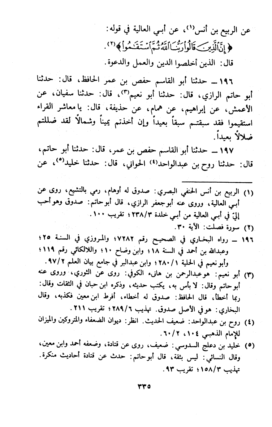 196 - حَدَّثَنَا أَبُو الْقَاسِمِ حَفْصُ بْنُ عُمَرَ الْحَافِظُ، قَالَ: حَدَّثَنَا أَبُو حَاتِمٍ الرَّازِيُّ، قَالَ: حَدَّثَنَا أَبُو نُعَيْمٍ، قَالَ: حَدَّثَنَا سُفْيَانُ، عَنِ الْأَعْمَشِ، عَنْ إِبْرَاهِيمَ، عَنْ هَمَّامٍ، عَنْ حُذَيْفَةَ، قَالَ: «§يَا مَعَاشِرَ الْقُرَّاءِ، اسْتَقِيمُوا، فَقَدْ سَبَقْتُمْ سَبْقًا بَعِيدًا، وَإِنْ أَخَذْتُمْ يَمِينًا وَشِمَالًا لَقَدْ ضَلَلْتُمْ ضَلَالًا بَعِيدًا»