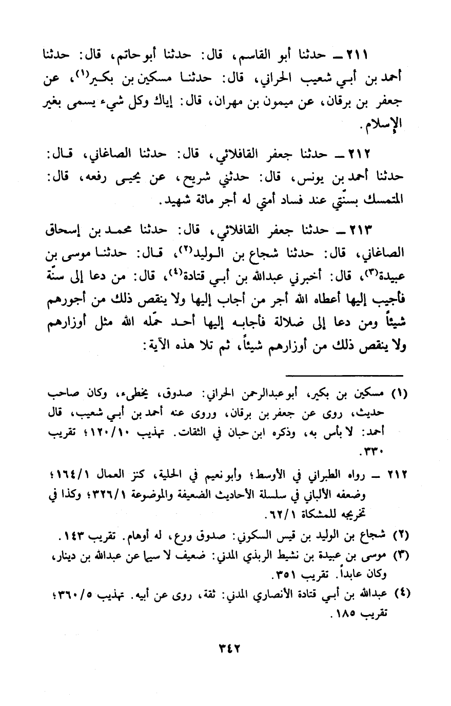 211 - حَدَّثَنَا أَبُو الْقَاسِمِ، قَالَ: حَدَّثَنَا أَبُو حَاتِمٍ، قَالَ: حَدَّثَنَا أَحْمَدُ بْنُ أَبِي شُعَيْبٍ الْحَرَّانِيُّ، قَالَ: حَدَّثَنَا مِسْكِينُ بْنُ بُكَيْرٍ، عَنْ جَعْفَرِ بْنِ بُرْقَانَ، عَنْ مَيْمُونِ بْنِ مِهْرَانَ، قَالَ: § «إِيَّاكَ وَكُلَّ شَيْءٍ يُسَمَّى بِغَيْرِ الْإِسْلَامِ»