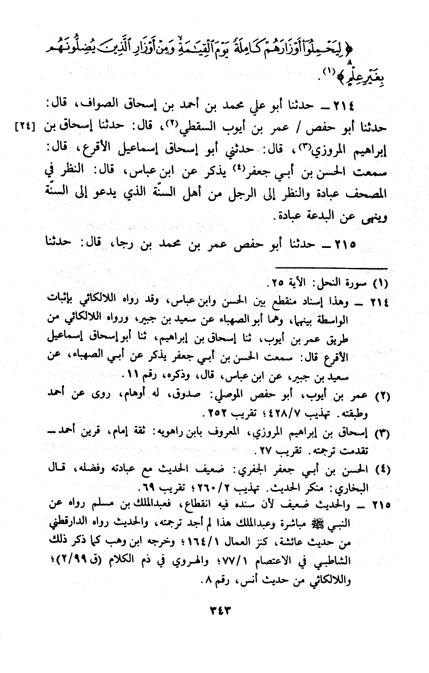 214 - حَدَّثَنَا أَبُو عَلِيٍّ مُحَمَّدُ بْنُ أَحْمَدَ بْنِ إِسْحَاقَ الصَّوَّافُ، قَالَ: حَدَّثَنَا أَبُو حَفْصٍ عُمَرُ بْنُ أَيُّوبَ السَّقَطِيُّ، قَالَ: حَدَّثَنَا إِسْحَاقُ بْنُ إِبْرَاهِيمَ الْمَرْوَزِيُّ، قَالَ: حَدَّثَنِي أَبُو إِسْحَاقَ إِسْمَاعِيلُ الْأَقْرَعُ، قَالَ: سَمِعْتُ الْحَسَنَ بْنَ أَبِي جَعْفَرٍ، يَذْكُرُ، عَنِ ابْنِ عَبَّاسٍ، قَالَ: «§النَّظَرُ فِي الْمُصْحَفِ عِبَادَةٌ، وَالنَّظَرُ إِلَى الرَّجُلِ مِنْ أَهْلِ السُّنَّةِ الَّذِي يَدْعُو إِلَى السُّنَّةِ، وَيَنْهَى عَنِ الْبِدْعَةِ عِبَادَةٌ»