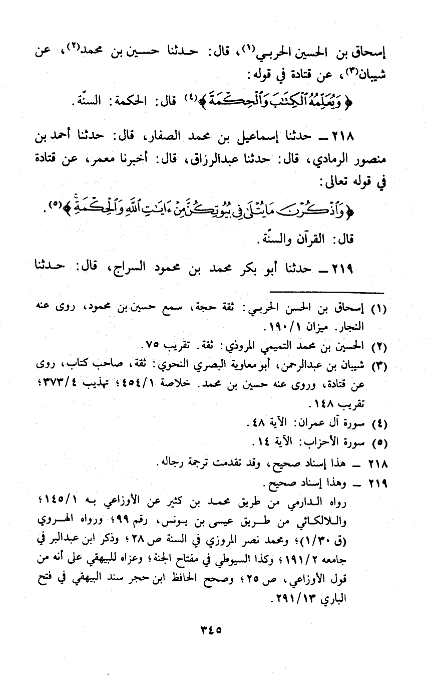 218 - حَدَّثَنَا إِسْمَاعِيلُ بْنُ مُحَمَّدٍ الصَّفَّارُ، قَالَ: حَدَّثَنَا أَحْمَدُ بْنُ مَنْصُورٍ الرَّمَادِيُّ، قَالَ: حَدَّثَنَا عَبْدُ الرَّزَّاقِ، قَالَ: أَخْبَرَنَا مَعْمَرٌ، عَنْ قَتَادَةَ فِي قَوْلِهِ تَعَالَى: {§وَاذْكُرْنَ مَا يُتْلَى فِي بُيُوتِكُنَّ مِنْ آيَاتِ اللَّهِ وَالْحِكْمَةِ} [الأحزاب: 34]، قَالَ: «الْقُرْآنُ وَالسُّنَّةُ»