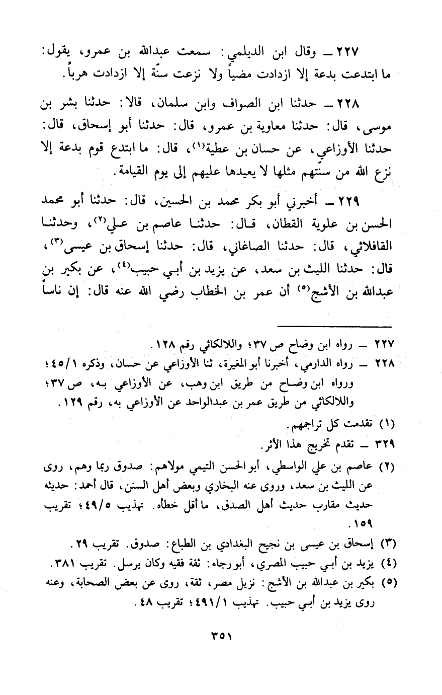 228 - حَدَّثَنَا ابْنُ الصَّوَّافِ، وَابْنُ سَلْمَانَ، قَالَا: حَدَّثَنَا بِشْرُ بْنُ مُوسَى، قَالَ: حَدَّثَنَا مُعَاوِيَةُ بْنُ عَمْرٍو، قَالَ: حَدَّثَنَا أَبُو إِسْحَاقَ، قَالَ: حَدَّثَنَا الْأَوْزَاعِيُّ، عَنْ حَسَّانَ بْنِ عَطِيَّةَ، قَالَ: § «مَا ابْتَدَعَ قَوْمٌ بِدْعَةً إِلَّا نَزَعَ اللَّهُ مِنْ سُنَّتِهِمْ مِثْلَهَا لَا يُعِيدُهَا عَلَيْهِمْ إِلَى يَوْمِ الْقِيَامَةِ»