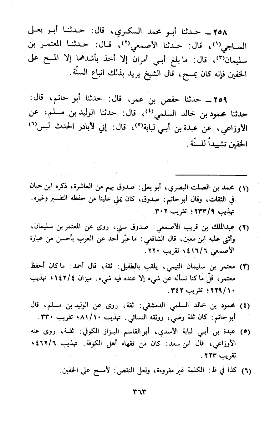 258 - حَدَّثَنَا أَبُو مُحَمَّدٍ السُّكَّرِيُّ، قَالَ: حَدَّثَنَا أَبُو يَعْلَى السَّاجِيُّ، قَالَ: حَدَّثَنَا الْأَصْمَعِيُّ، قَالَ: حَدَّثَنَا الْمُعْتَمِرُ بْنُ سُلَيْمَانَ، قَالَ: § «مَا بَلَغَ أَبِي أَمْرَانِ إِلَّا أَخَذَ بِأَشَدِّهُمَا إِلَّا الْمَسْحَ عَلَى الْخُفَّيْنِ، فَإِنَّهُ كَانَ يَمْسَحُ». قَالَ الشَّيْخُ: «يُرِيدُ بِذَلِكَ اتِّبَاعَ السُّنَّةِ»