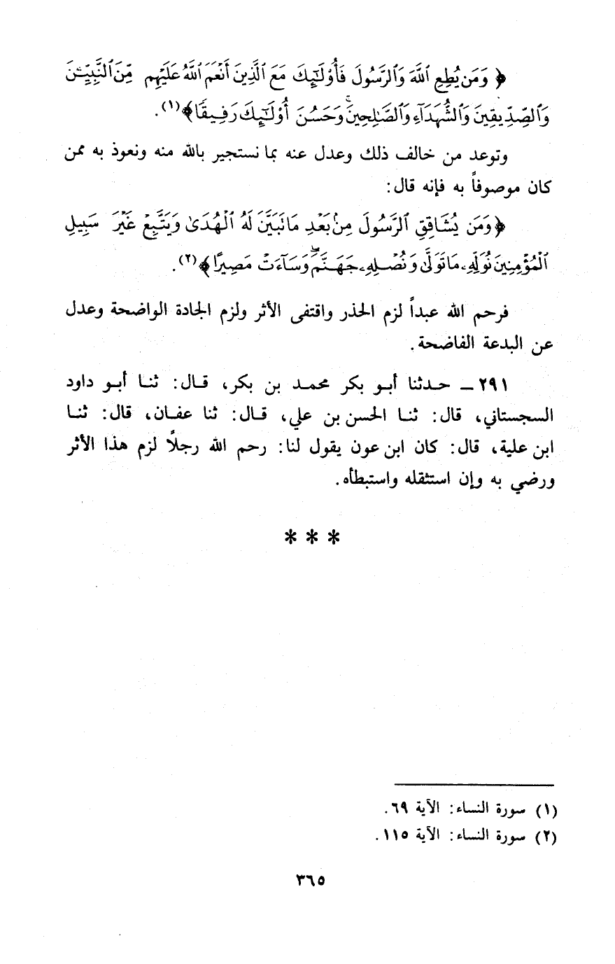 261 - حَدَّثَنَا أَبُو بَكْرٍ مُحَمَّدُ بْنُ بَكْرٍ، قَالَ: ثنا أَبُو دَاوُدَ السِّجِسْتَانِيُّ، قَالَ: ثنا الْحَسَنُ بْنُ عَلِيٍّ، قَالَ: ثنا عَفَّانُ، قَالَ: ثنا ابْنُ عُلَيَّةَ، قَالَ: كَانَ ابْنُ عَوْنٍ يَقُولُ لَنَا: «§رَحِمَ اللَّهُ رَجُلًا لَزِمَ هَذَا الْأَثَرَ، وَرَضِيَ بِهِ، وَإِنِ اسْتَثْقَلَهُ وَاسْتَبْطَأَهُ»