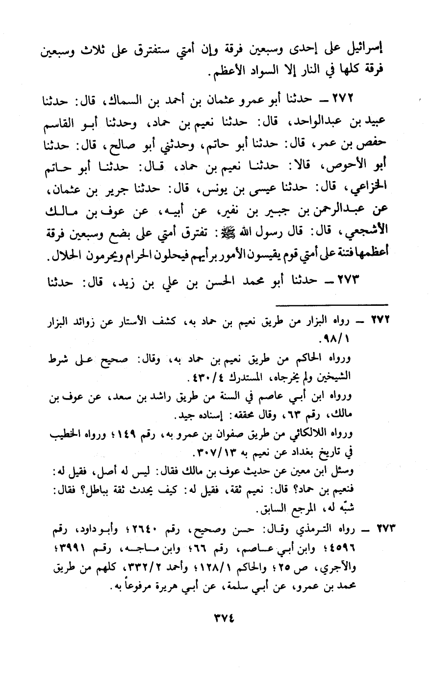 272 - حَدَّثَنَا أَبُو عَمْرٍو عُثْمَانُ بْنُ أَحْمَدَ بْنِ السَّمَّاكِ، قَالَ: حَدَّثَنَا عُبَيْدُ بْنُ عَبْدِ الْوَاحِدِ، قَالَ: حَدَّثَنَا نُعَيْمُ بْنُ حَمَّادٍ، وَحَدَّثَنَا أَبُو الْقَاسِمِ حَفْصُ بْنُ عُمَرَ، قَالَ: حَدَّثَنَا أَبُو حَاتِمٍ، وَحَدَّثَنِي أَبُو صَالِحٍ، قَالَ: حَدَّثَنَا أَبُو الْأَحْوَصِ، قَالَا: حَدَّثَنَا نُعَيْمُ بْنُ حَمَّادٍ، قَالَ: حَدَّثَنَا أَبُو حَاتِمٍ الْخُزَاعِيُّ، قَالَ: حَدَّثَنَا عِيسَى بْنُ يُونُسَ، قَالَ: حَدَّثَنَا حَرِيزُ بْنُ عُثْمَانَ، عَنْ عَبْدِ الرَّحْمَنِ بْنِ جُبَيْرِ بْنِ نُفَيْرٍ، عَنْ أَبِيهِ، عَنْ عَوْفِ بْنِ مَالِكٍ الْأَشْجَعِيِّ، قَالَ: قَالَ رَسُولُ اللَّهِ صَلَّى اللَّهُ عَلَيْهِ وَسَلَّمَ: § «تَفْتَرِقُ أُمَّتِي عَلَى بِضْعٍ وَسَبْعِينَ فِرْقَةً أَعْظَمُهَا فِتْنَةً عَلَى أُمَّتِي قَوْمٌ يَقِيسُونَ الْأُمُورَ بِرَأْيِهِمْ، فَيُحِلُّونَ الْحَرَامَ، وَيُحَرِّمُونَ الْحَلَالَ»